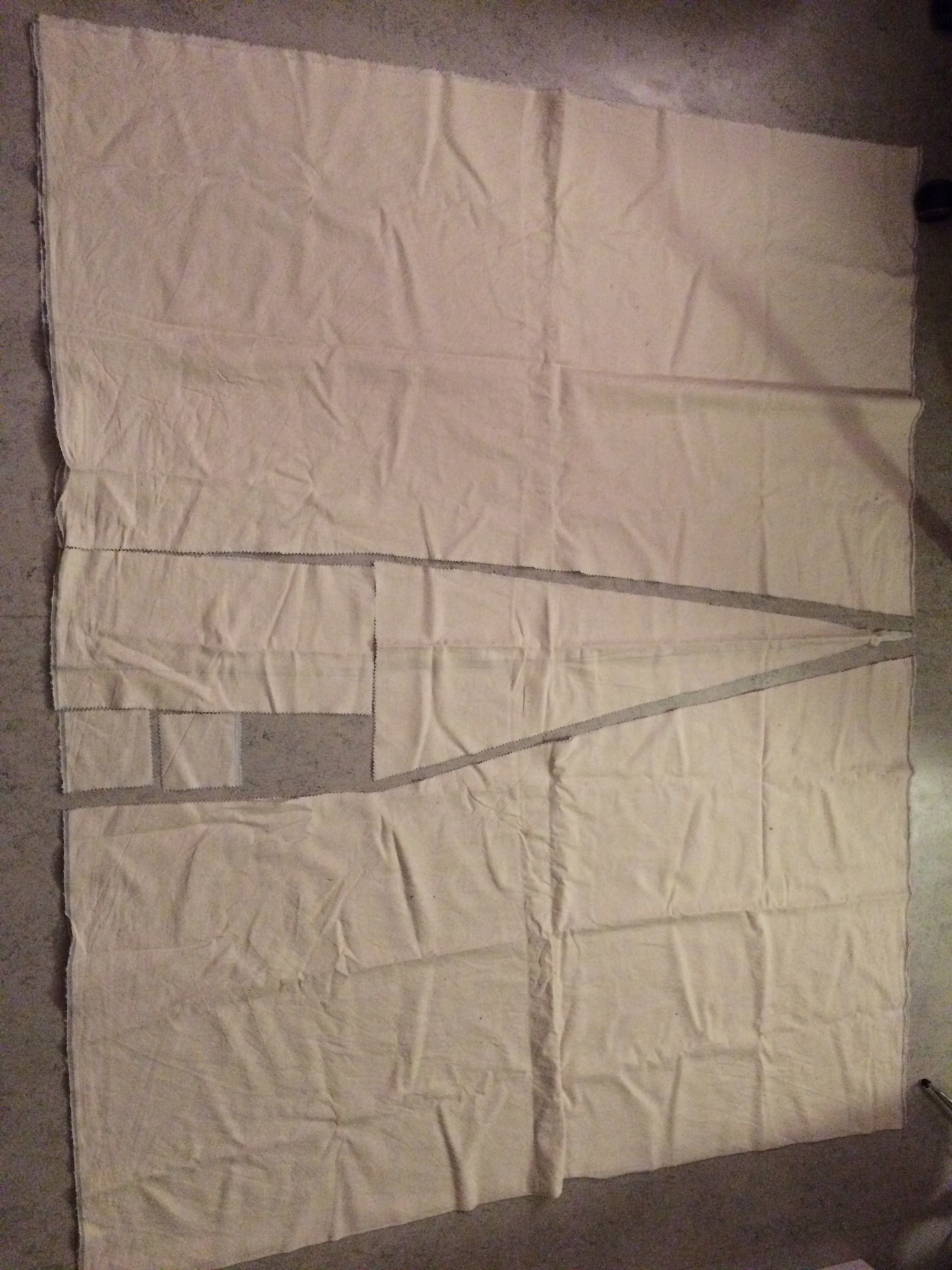 The two large pieces are the main part of the dresses, they are as long as I want my dress to be (from shoulder to about mid-calf) and as wide as my chest measurement divided by 2 (plus some ease for breathing and seamallowance, between 5cm and 10cm). The triangle in the middle will make two side gores, one for each dress, the length is from my waist to the bottom of the chemise. The top rectangle will make two sleeves, each as wide as the circumference of my arms plus seam allowance, and about T-shirt sleeve length. The two squares will make four underarm gores. The only piece of fabric not used, is the one marked with grey. Maybe I’ll make hankerchiefs out of it?