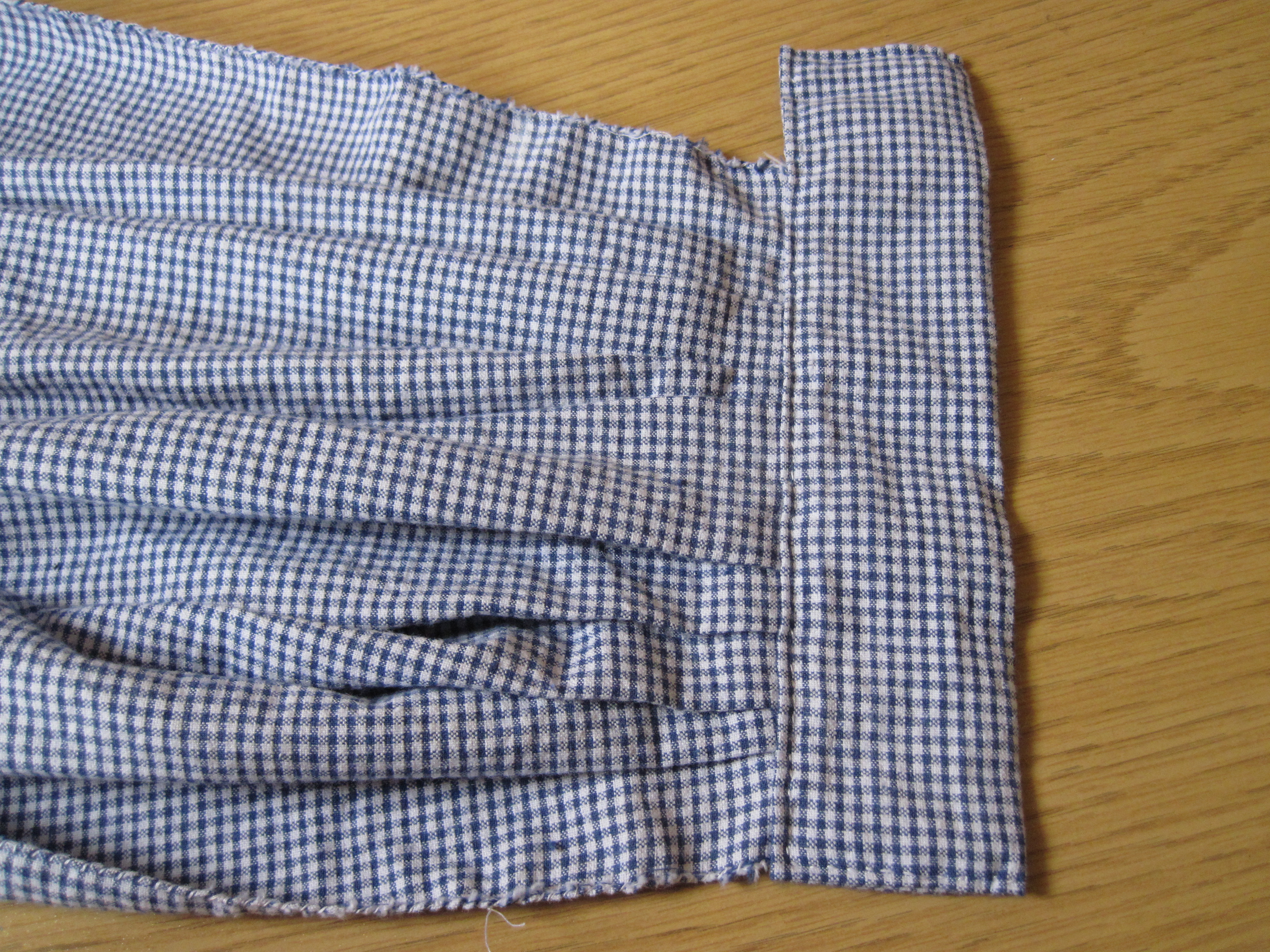 Hem the front split, and make a collar the same way we made the cuff for the sleeve above. If the opening is too large for the collar, you can make a small pleat in the back of the neck.