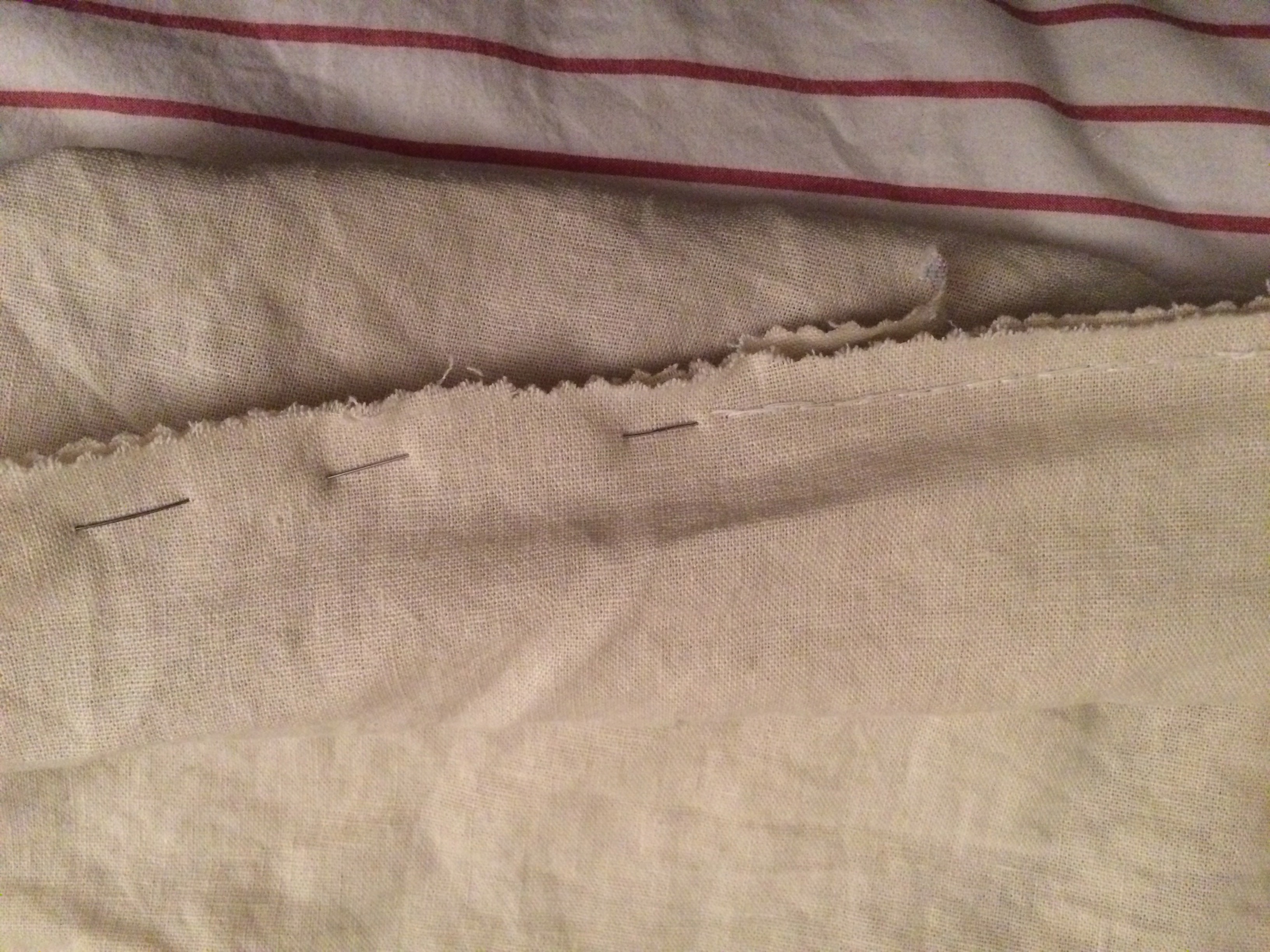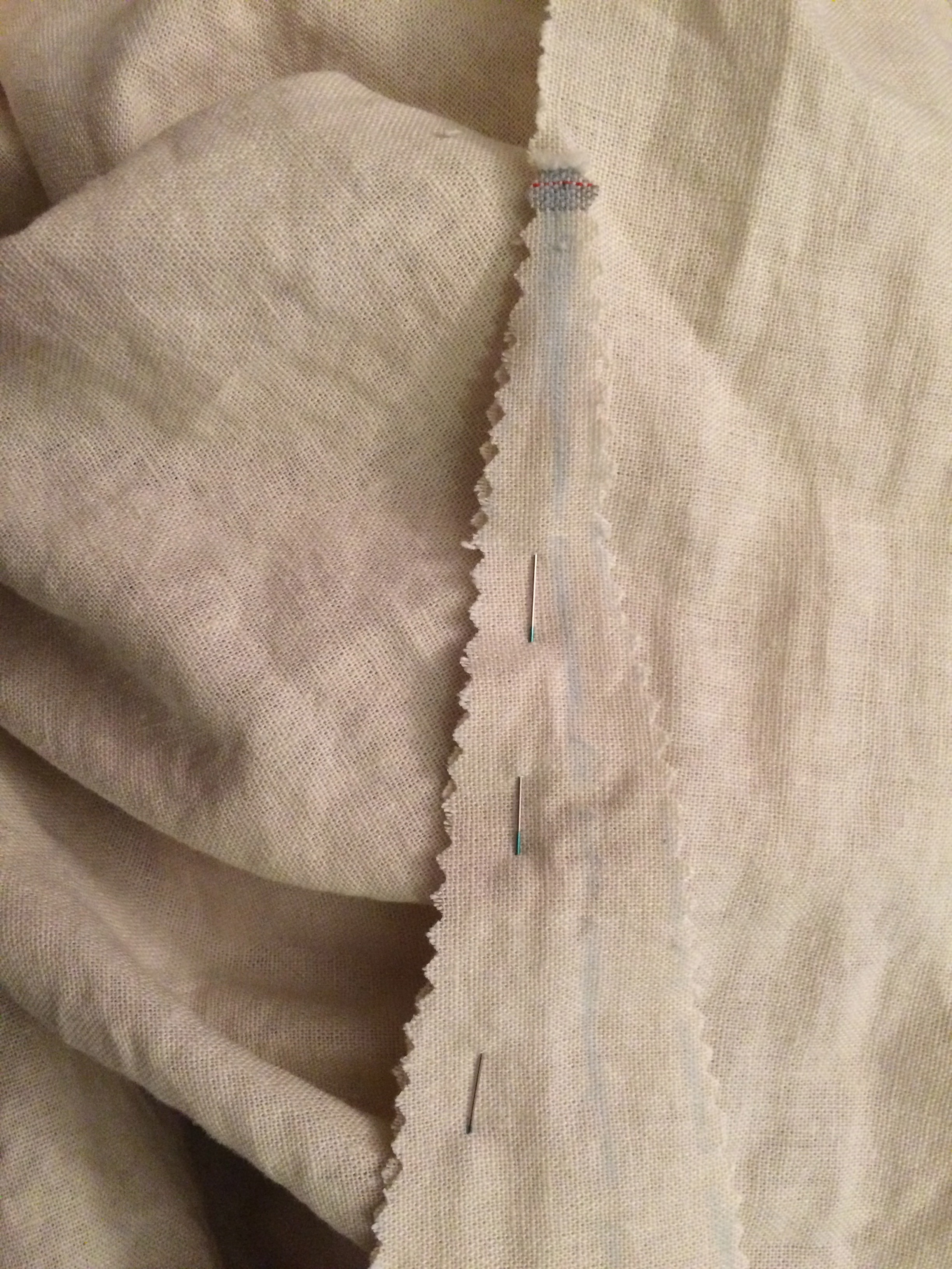Here, you see how the first pin starts where the seam ends. The seam is the one holding together the sides of the garment above the gore.