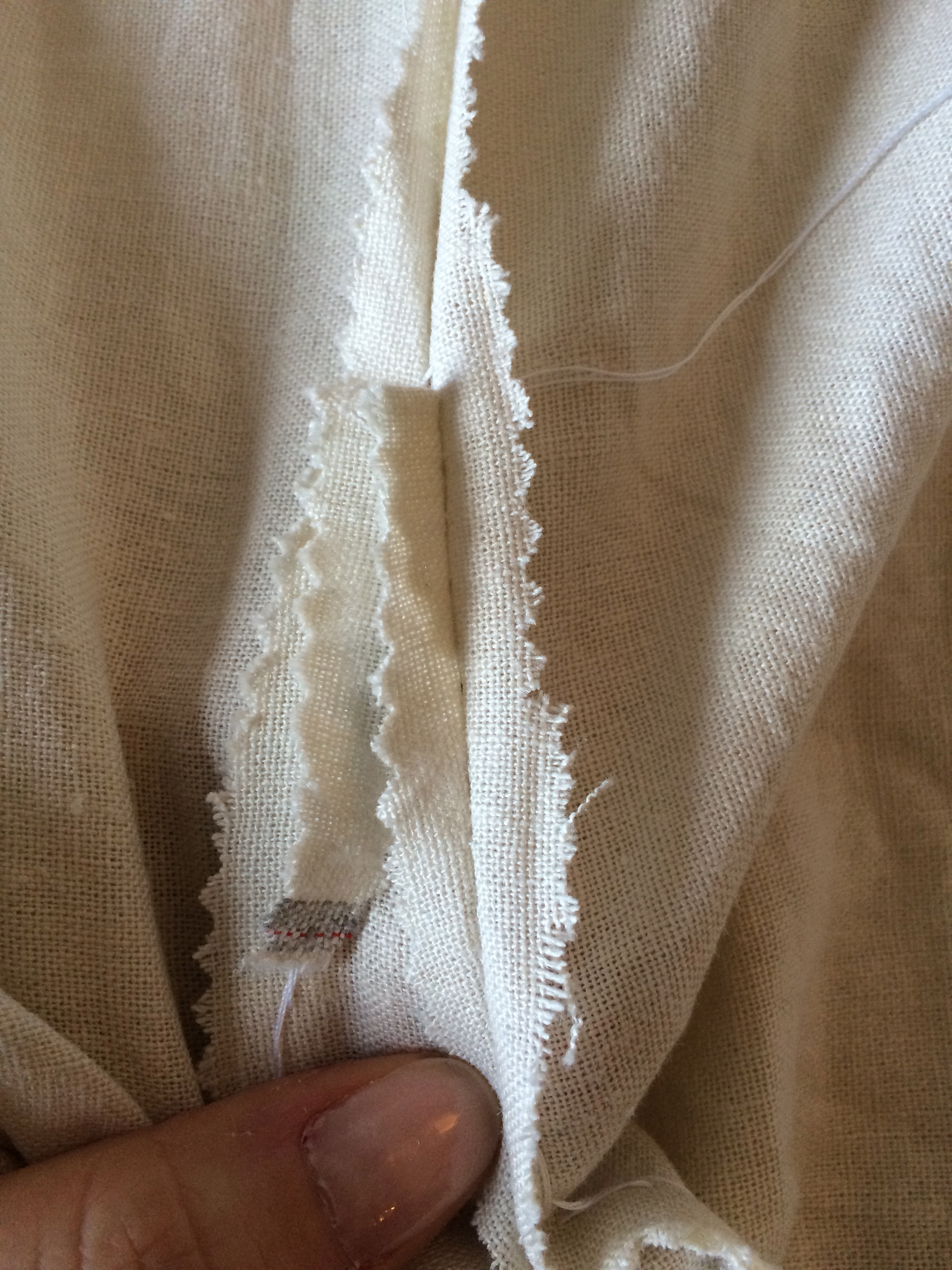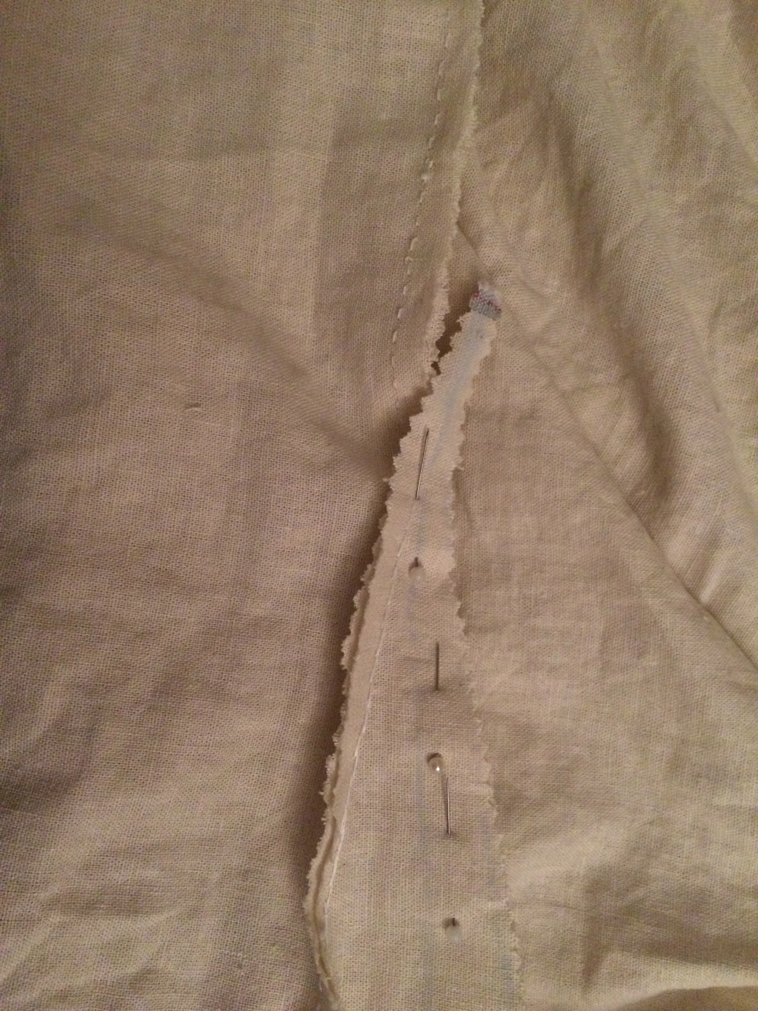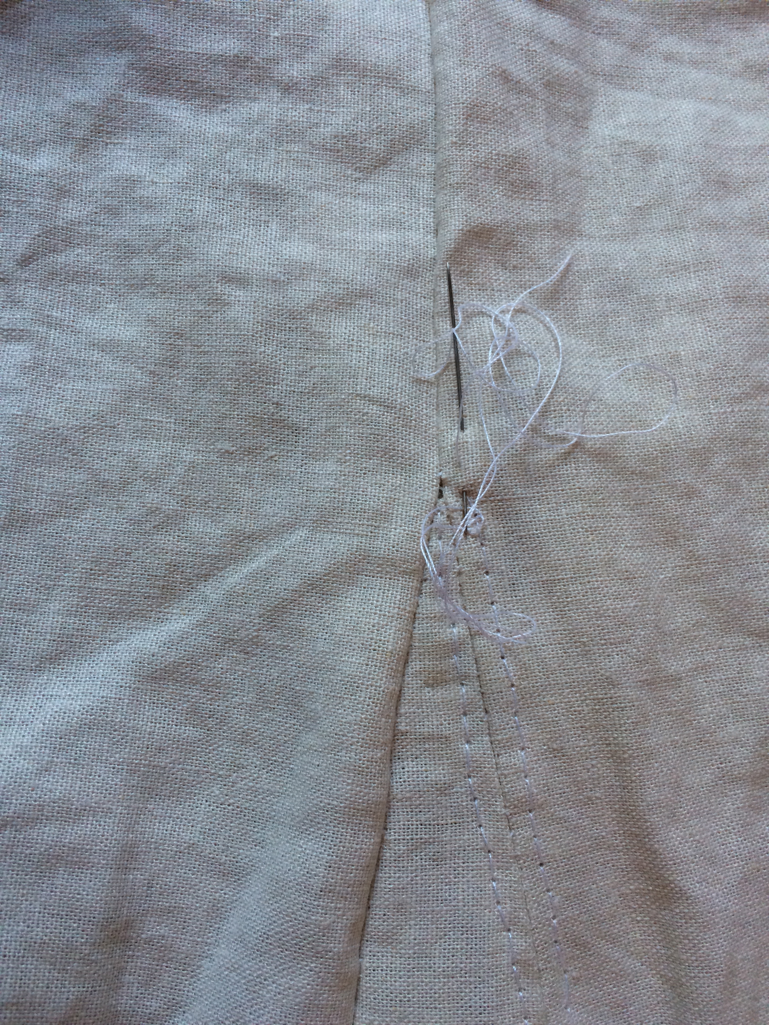 You can just about make out where the gores go on my very wrinkly chemise. You can also see my small triangle gores under the armholes. I made them the same way I did on the first chemise, however, instead of fastening them to a sleeve, I folded them over and fastened them to the inside.