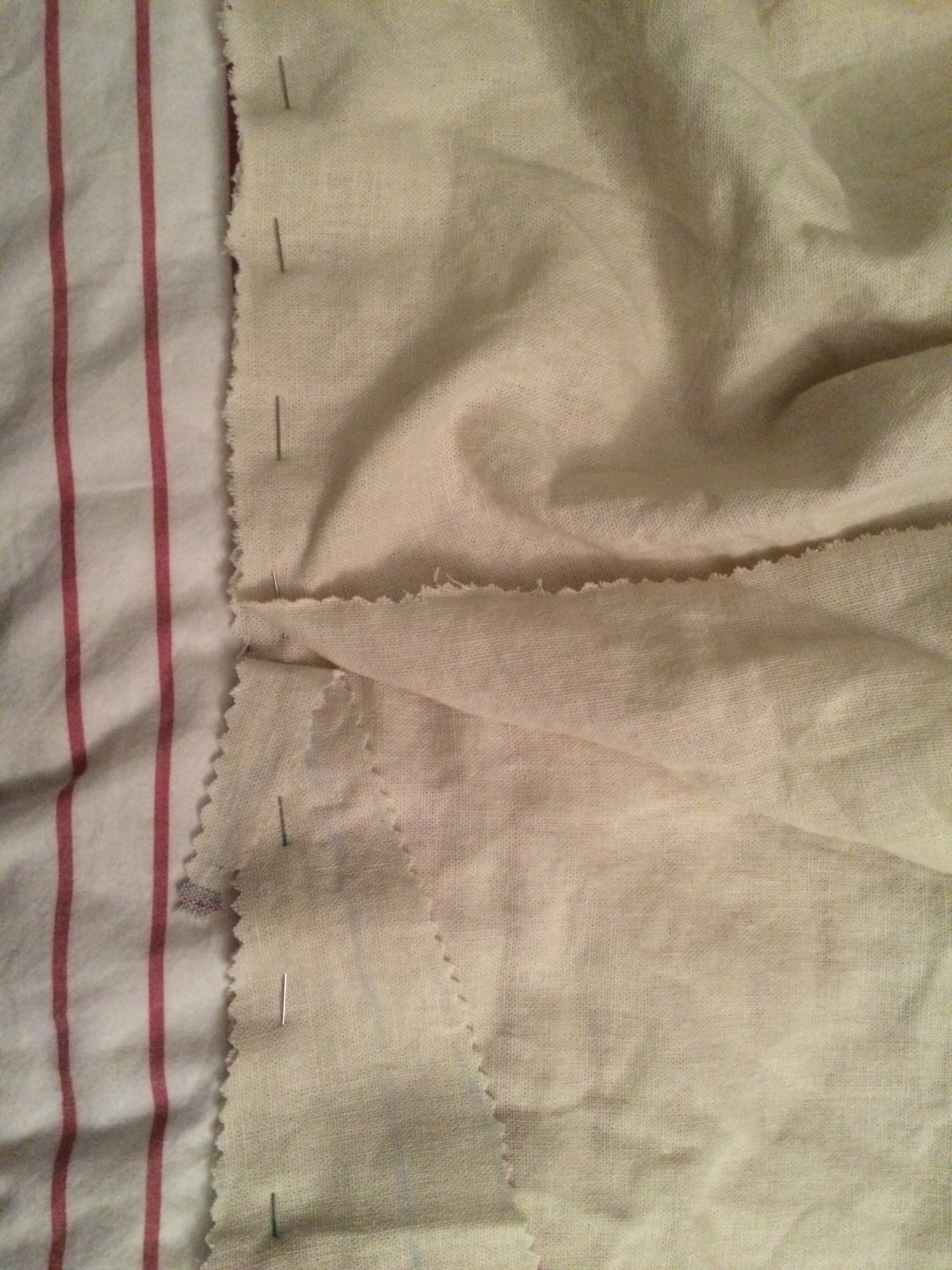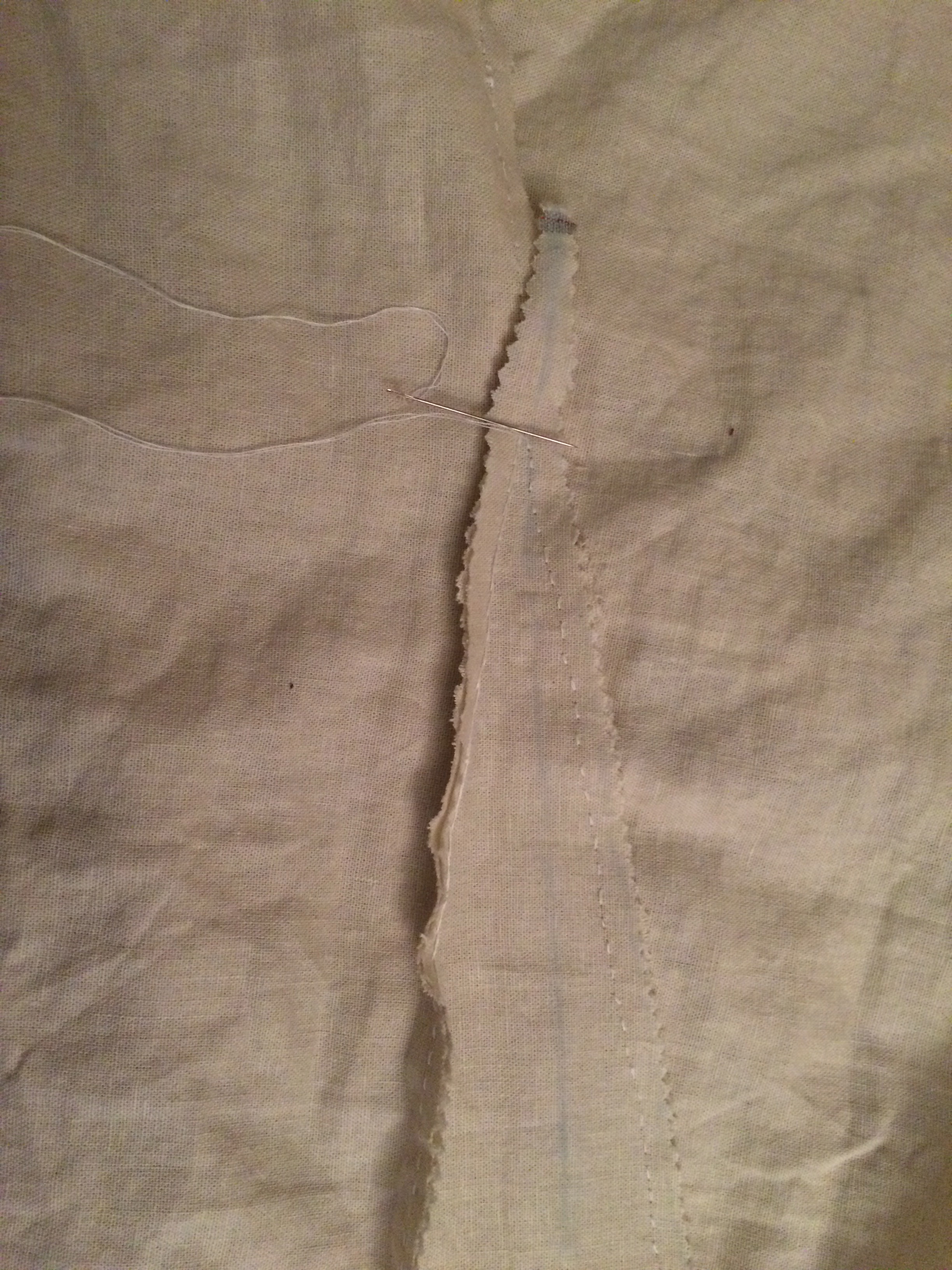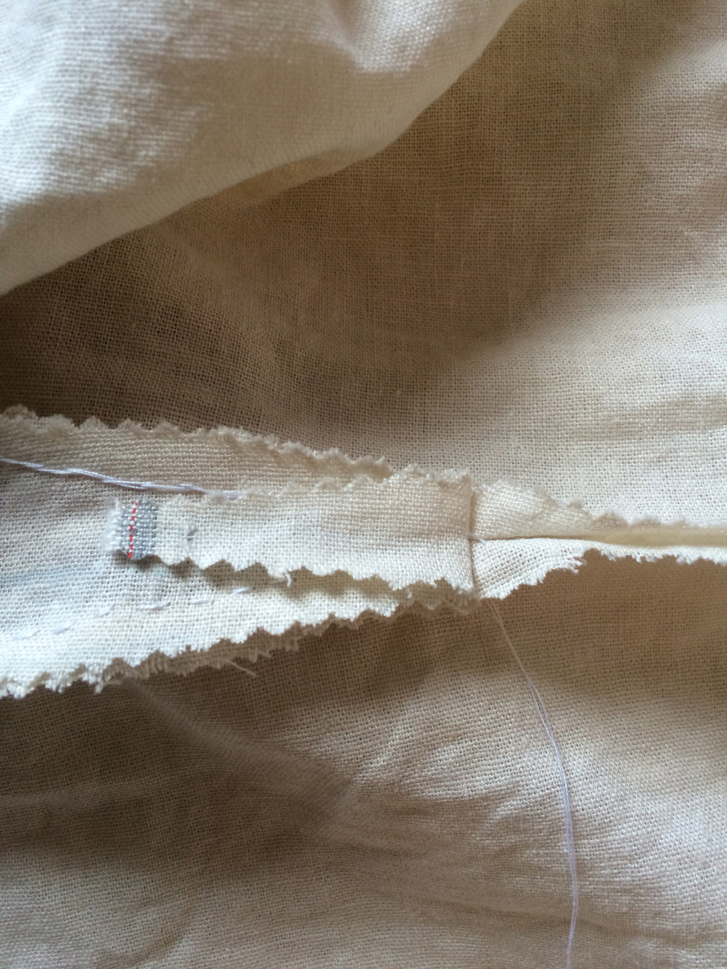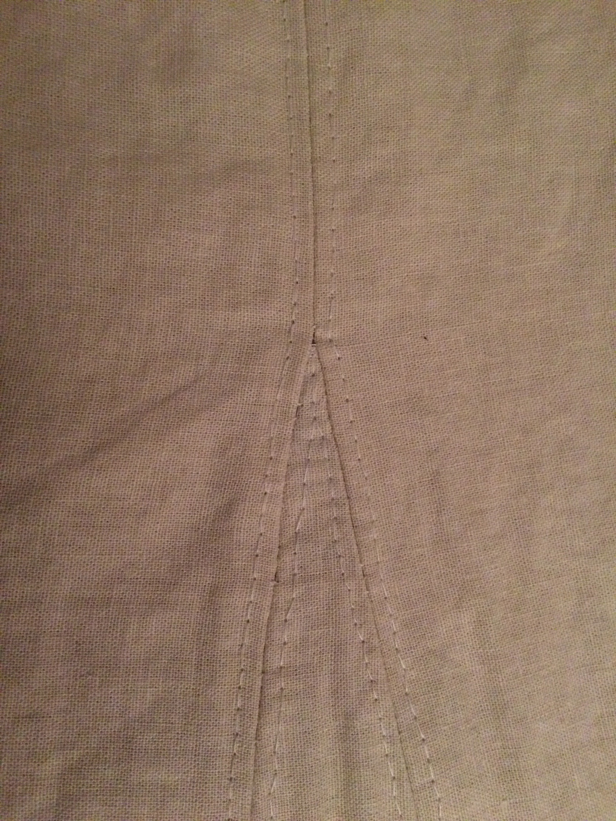 You can just about make out where the gores go on my very wrinkly chemise. You can also see my small triangle gores under the armholes. I made them the same way I did on the first chemise, however, instead of fastening them to a sleeve, I folded them over and fastened them to the inside.