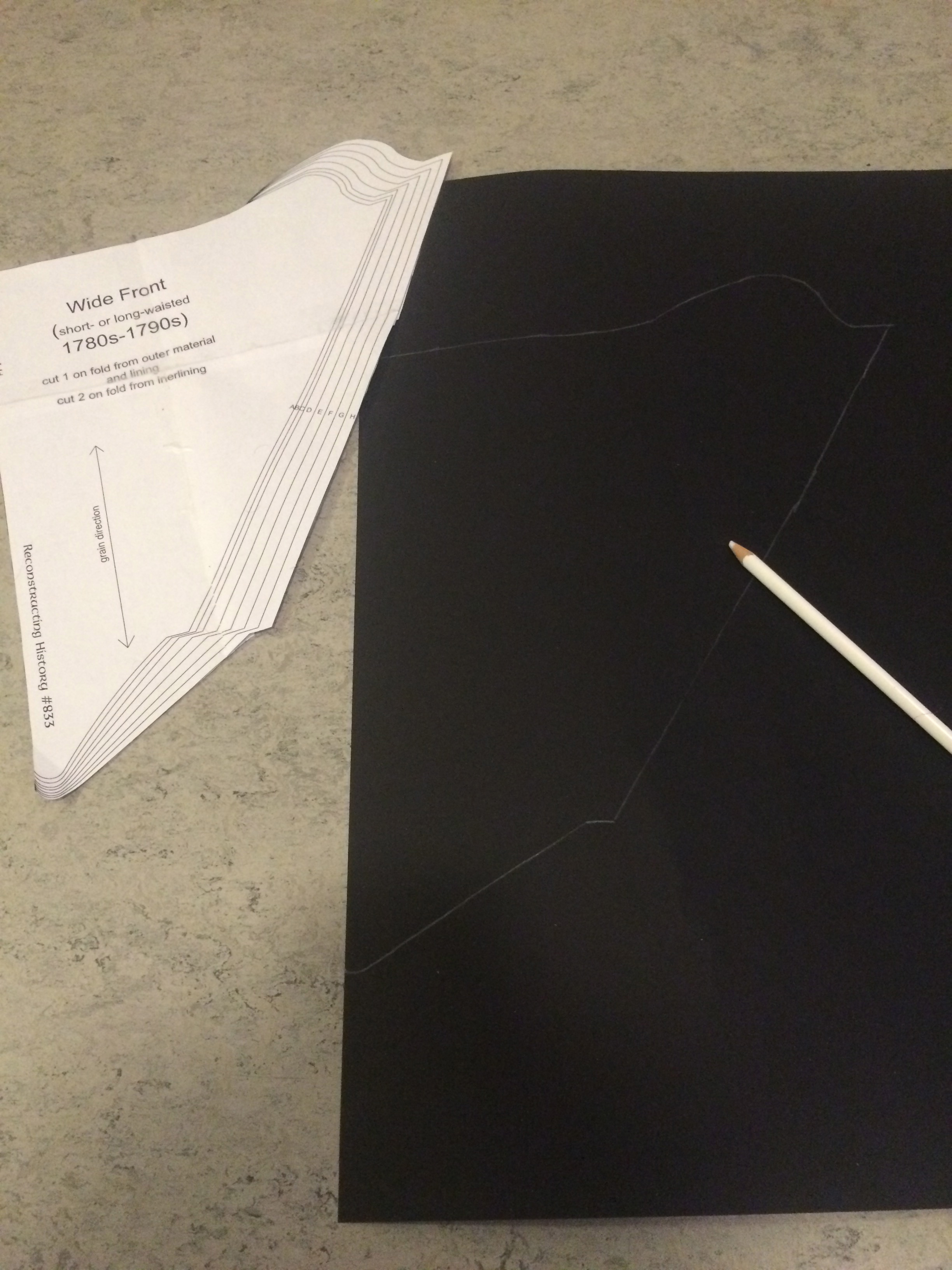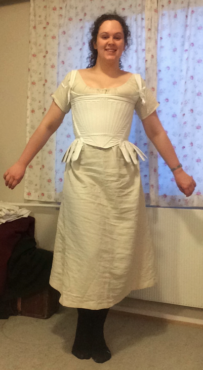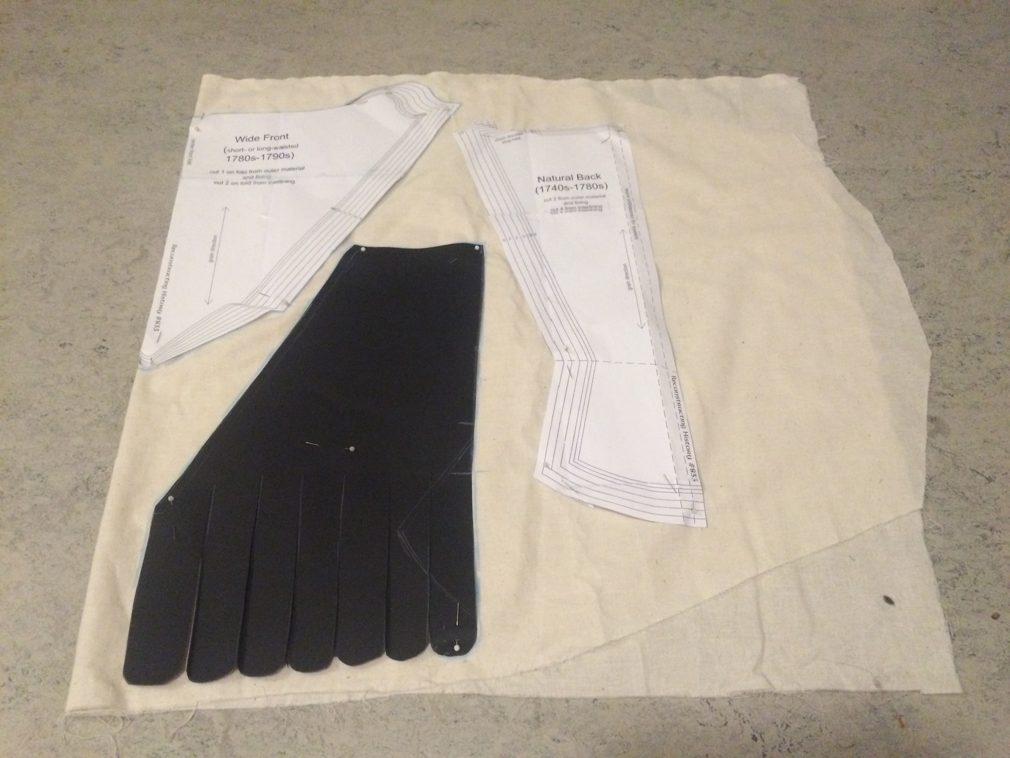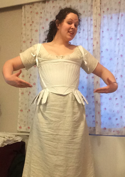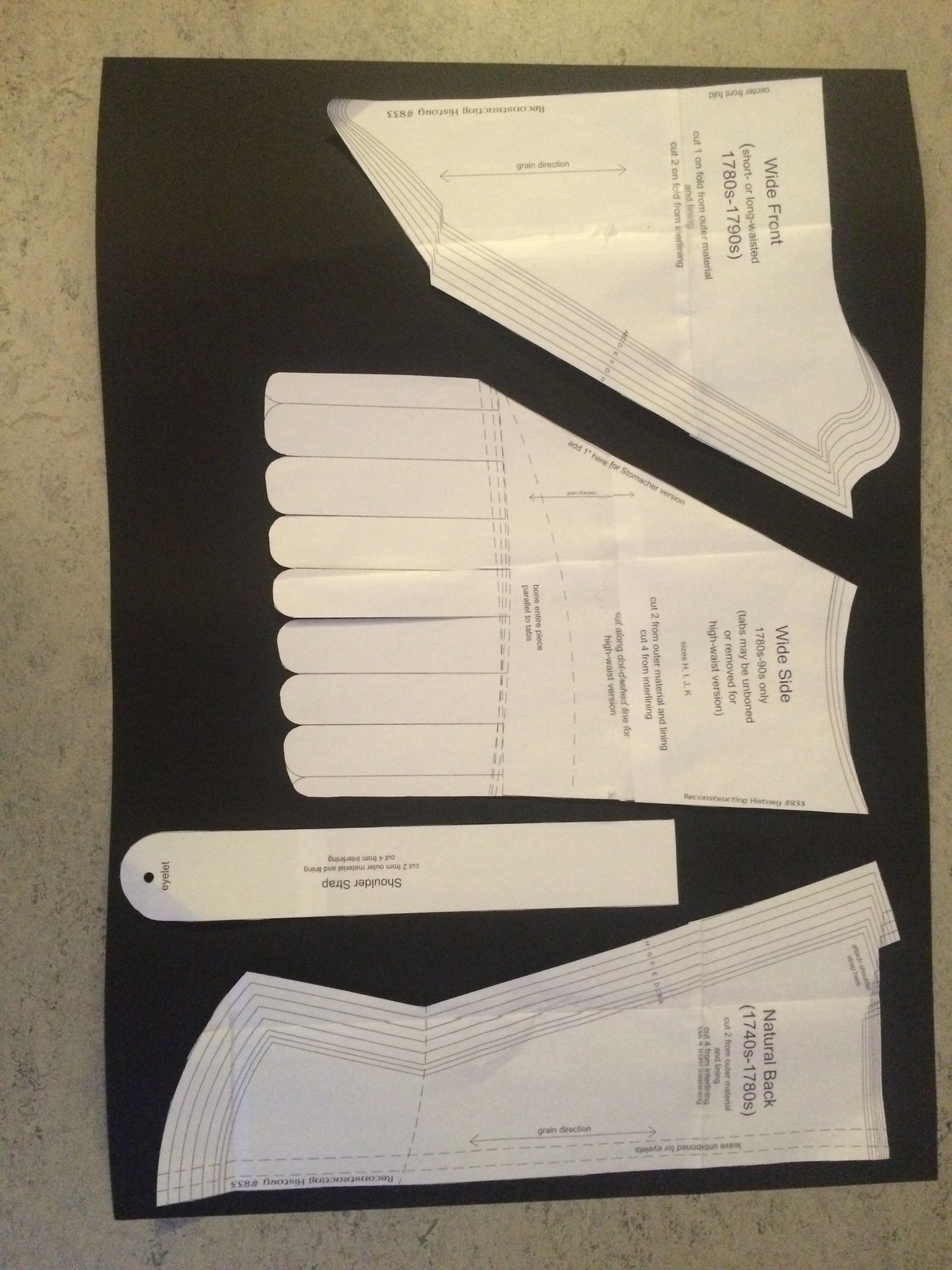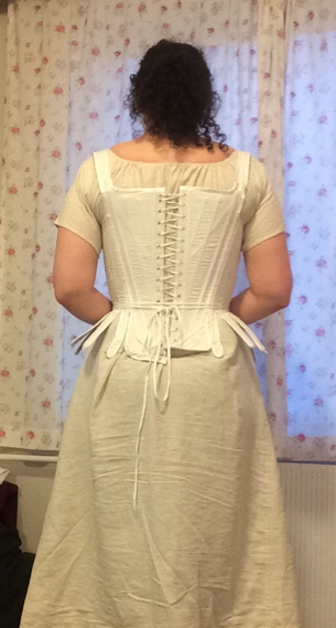 I used this pattern, and did the 1780s model, as it had the supportive “flaps” over the hips to help carry the weight of petticoats and dresses.