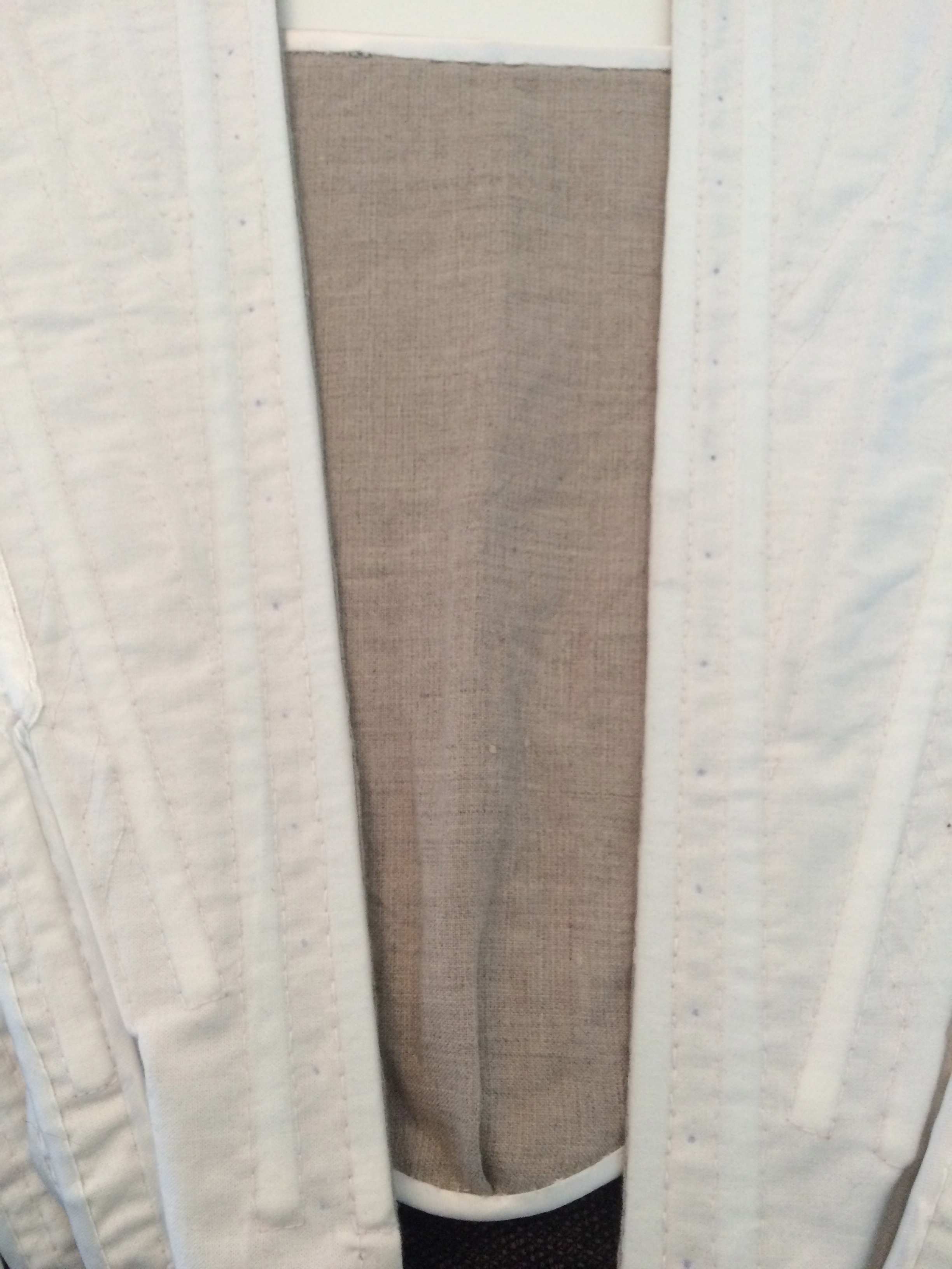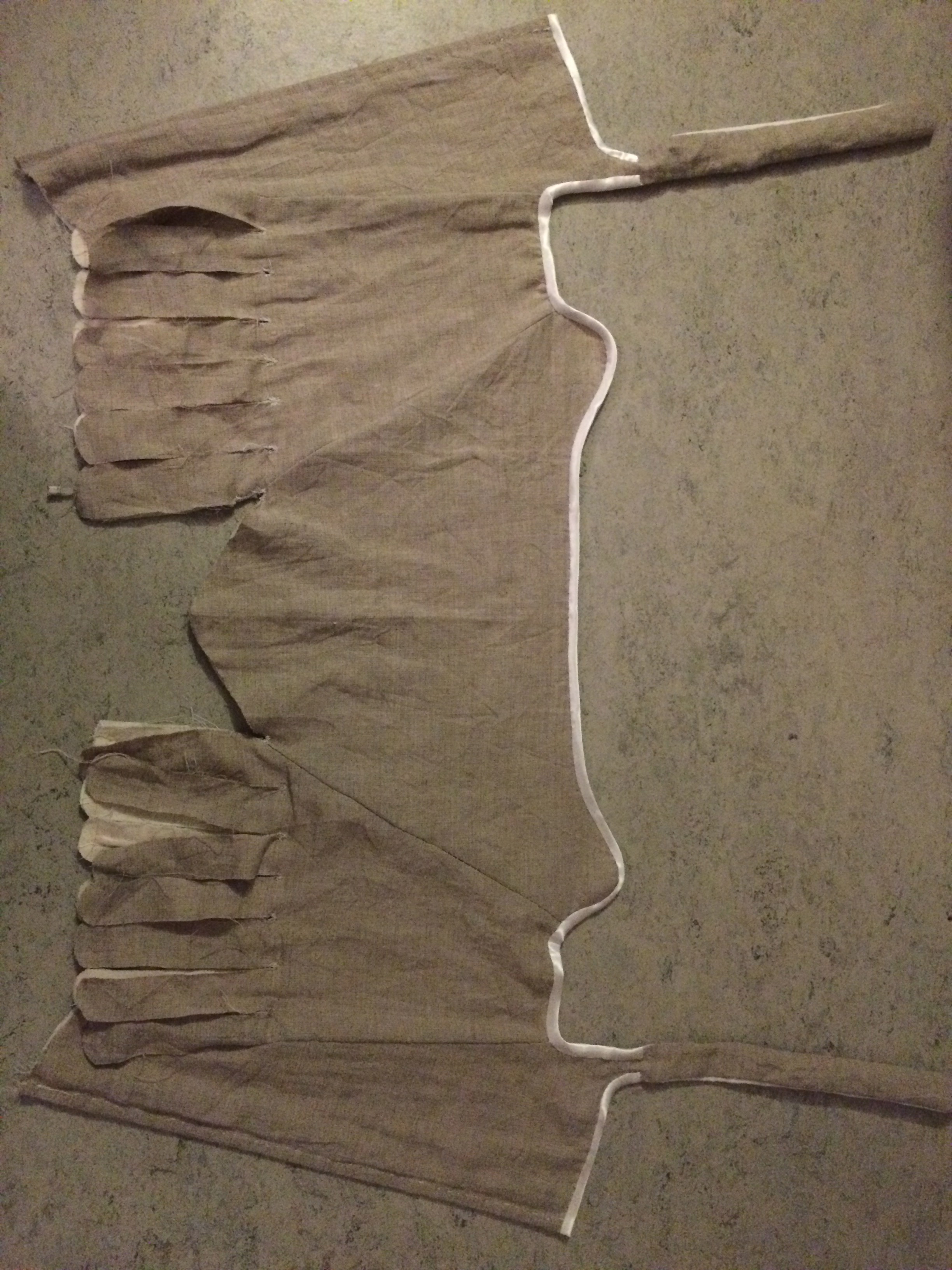 The lining pieces being stitched together. The lining should not be attached to the rest of the garment, other than around the edges. The front panel lining was topstitched onto the rest of the lining panels.