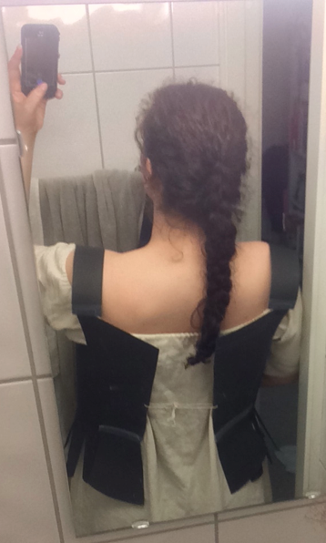 I got a tip that cardboard was better than muslin or canvas for a mockup, as it behaves more like boned corset. However, the process was not alltogether unproblematic, as it was hard to keep the mockup together at the back. However, it granted me some idea of how the pattern fit.