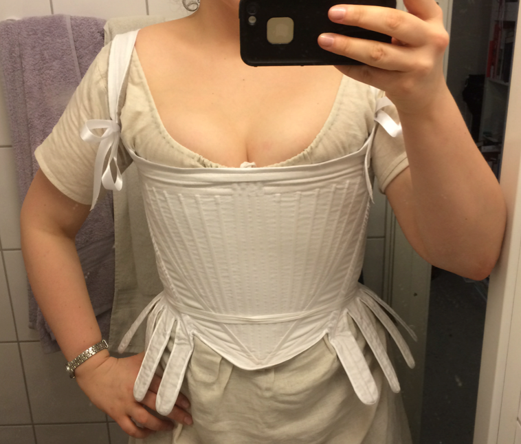 18th century stays are supposed to give you a smooth, conical shape, and lift your bosom. In that respect, I’d say these stays are a success!