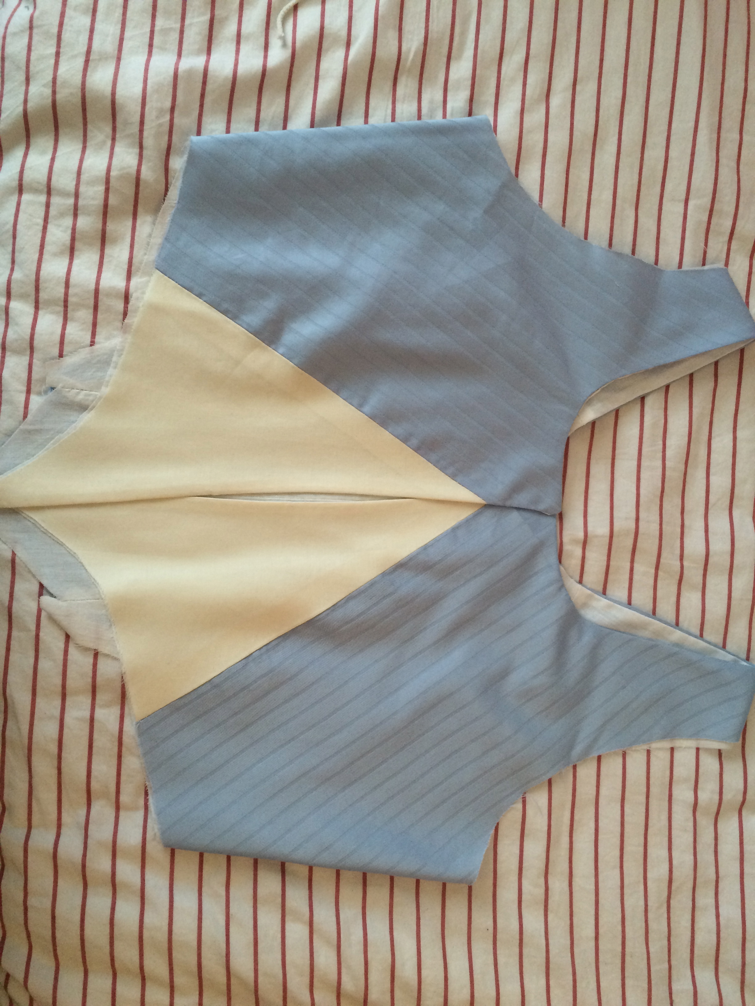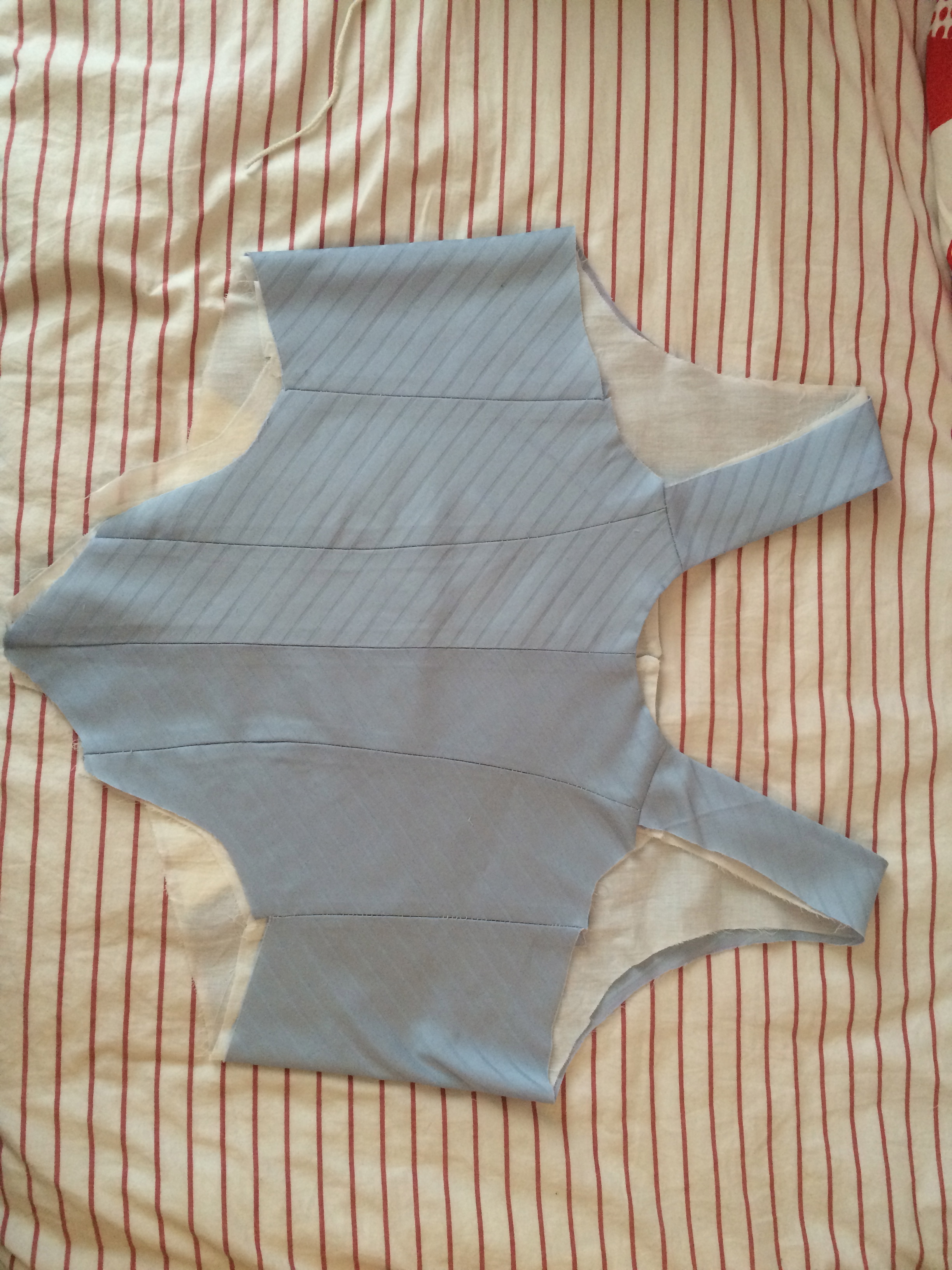 When all was drawn and cut (took a while, and I had to do it twice, because I momentarily forgot the concept of seam allowances the first time around), i started with the back, attempting to create said v-shapes.