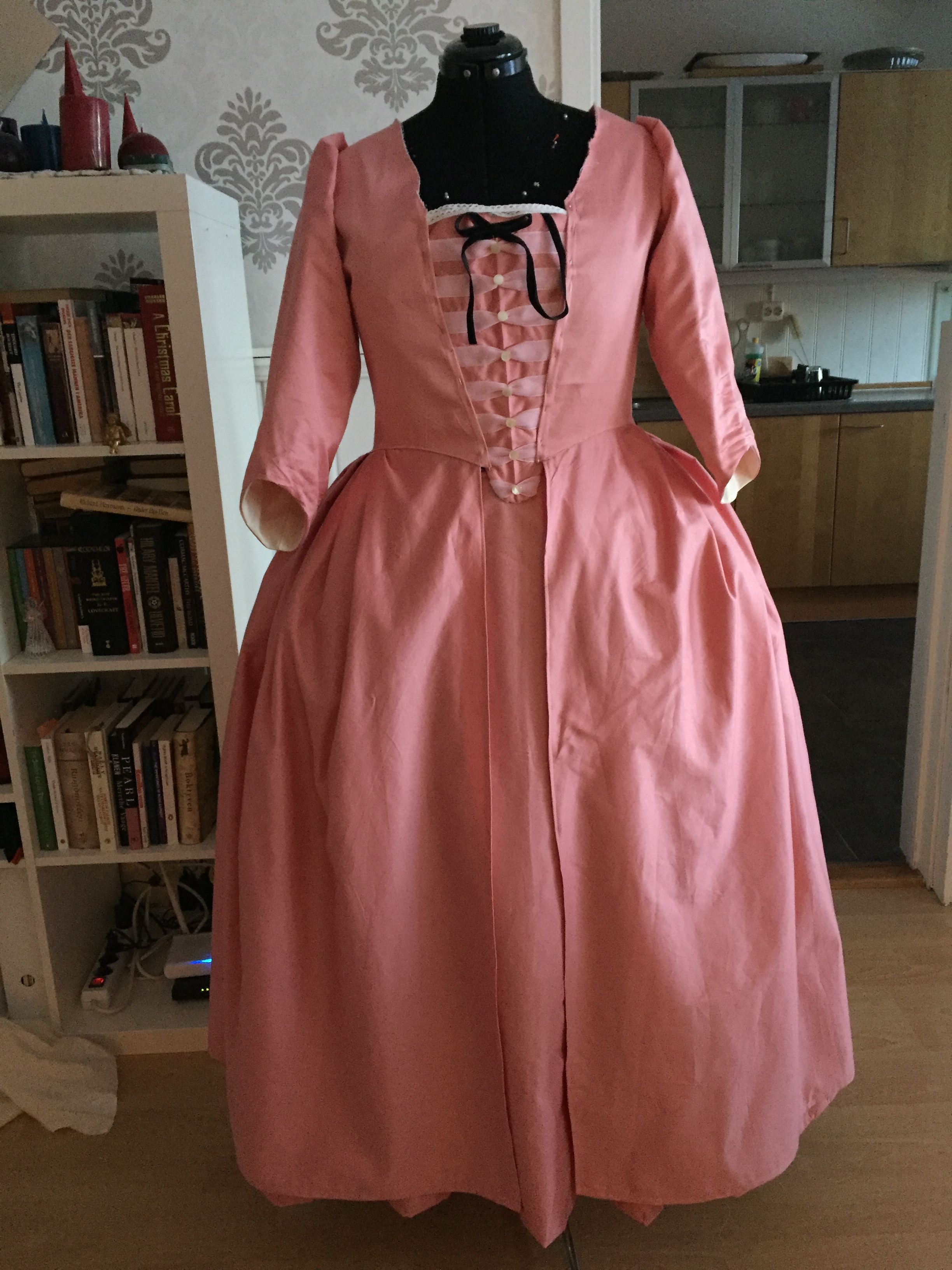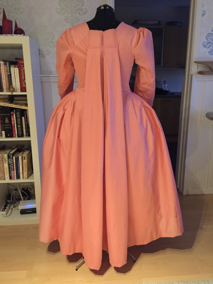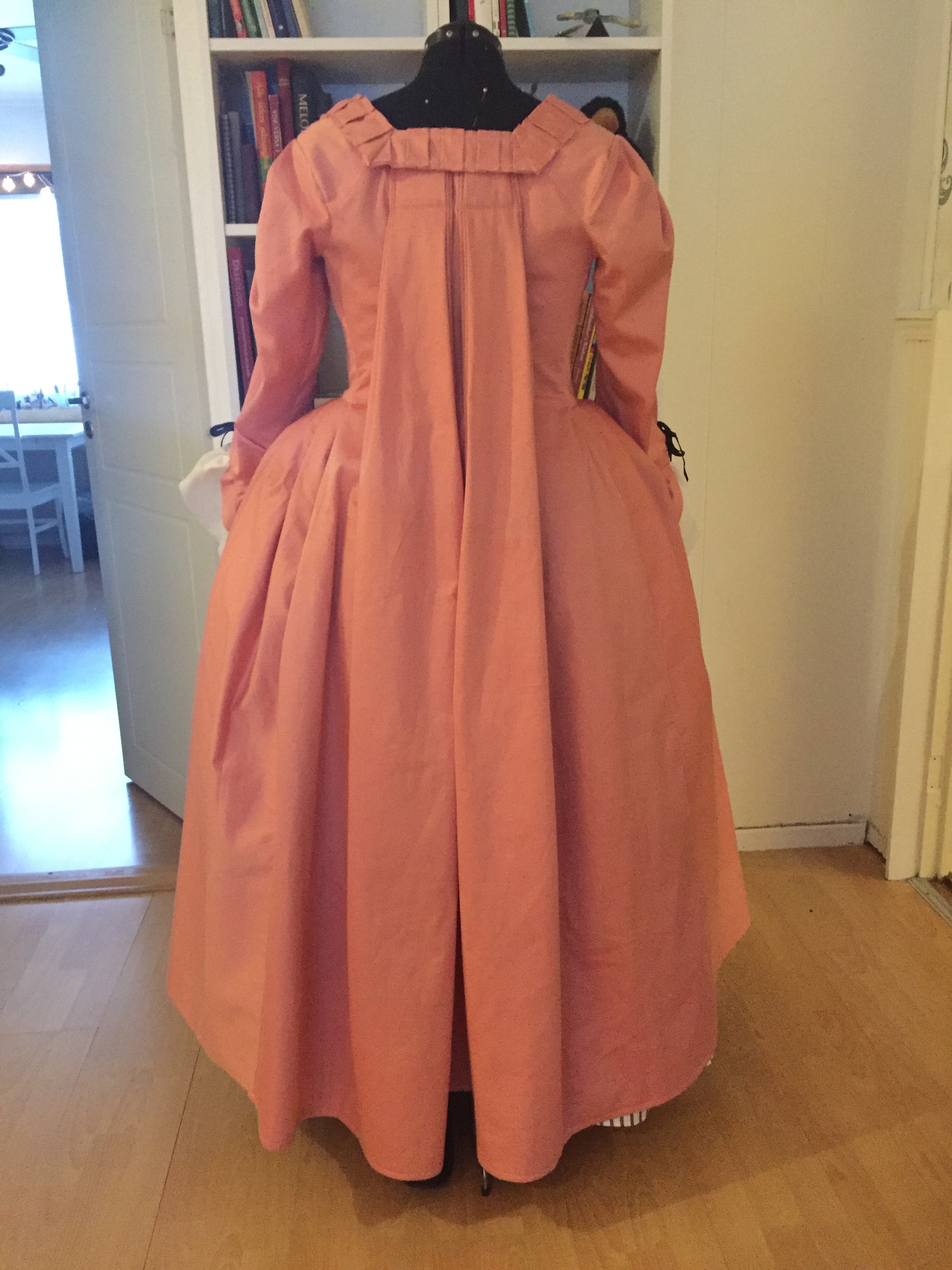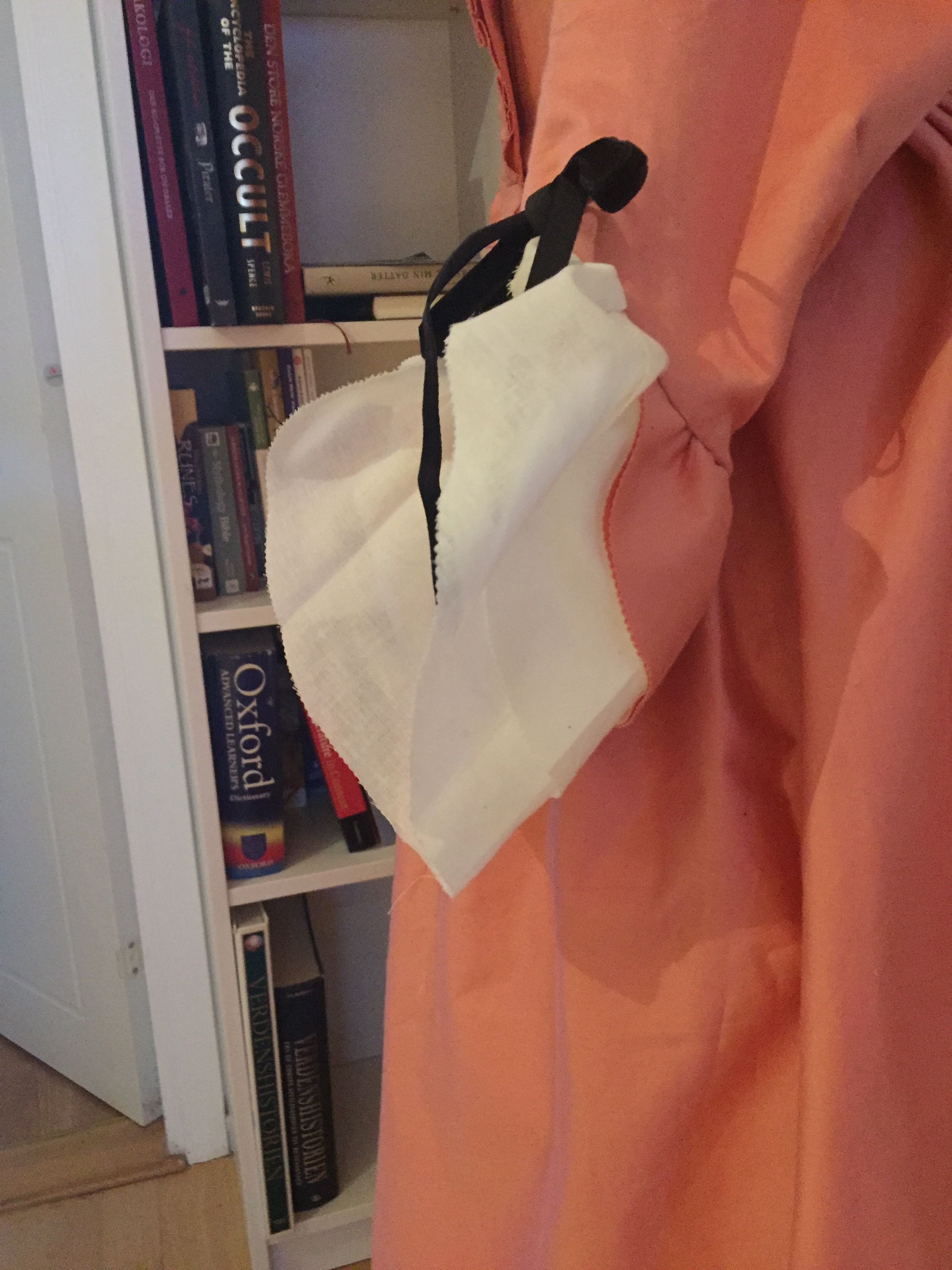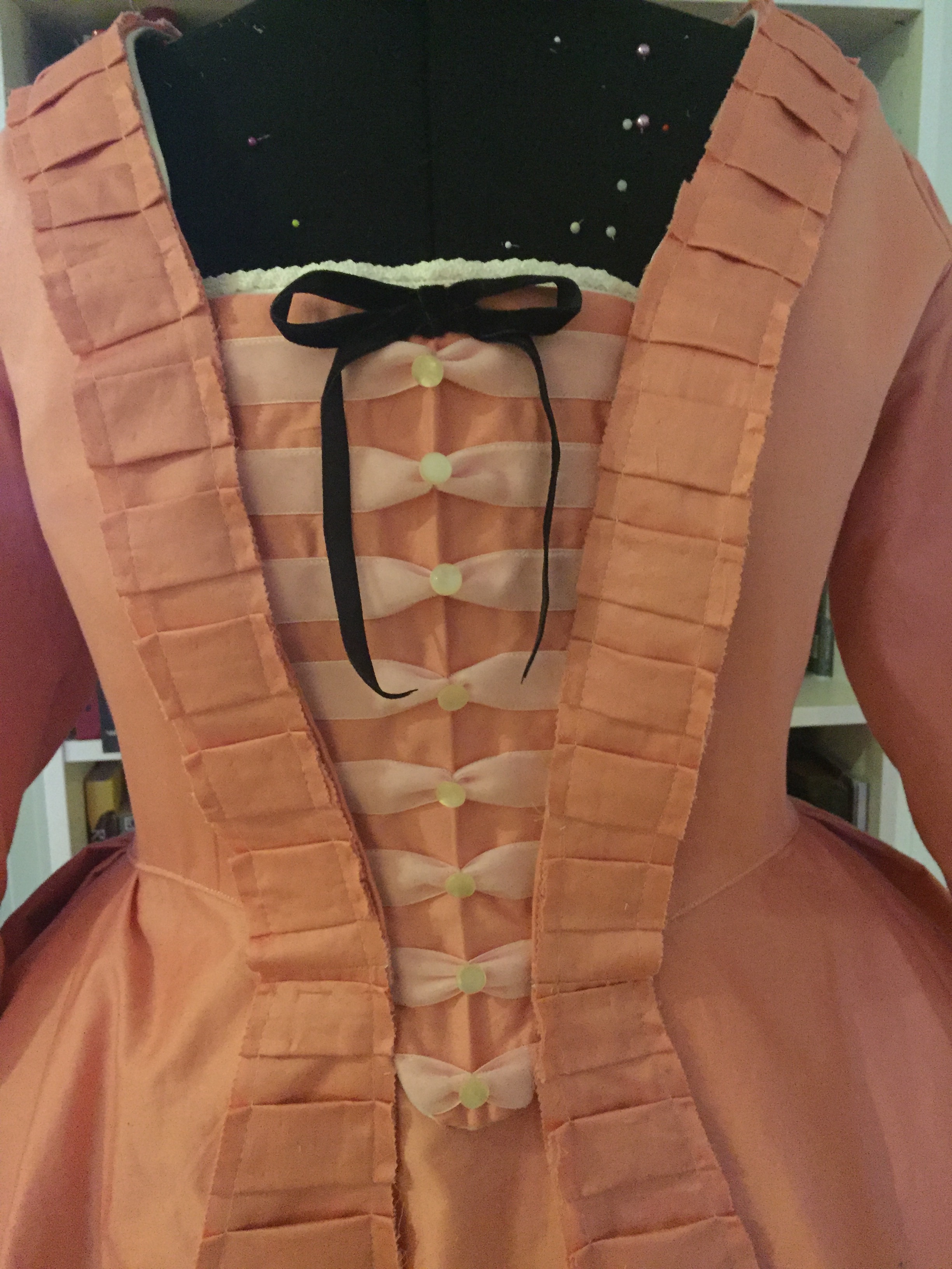 These dresses have an opening up the back on the inside, “behind” the big back pleats so to say. This makes the width of the bodice somewhat adjustable, and is usually closed with either ties or lacing. I opted for ties.