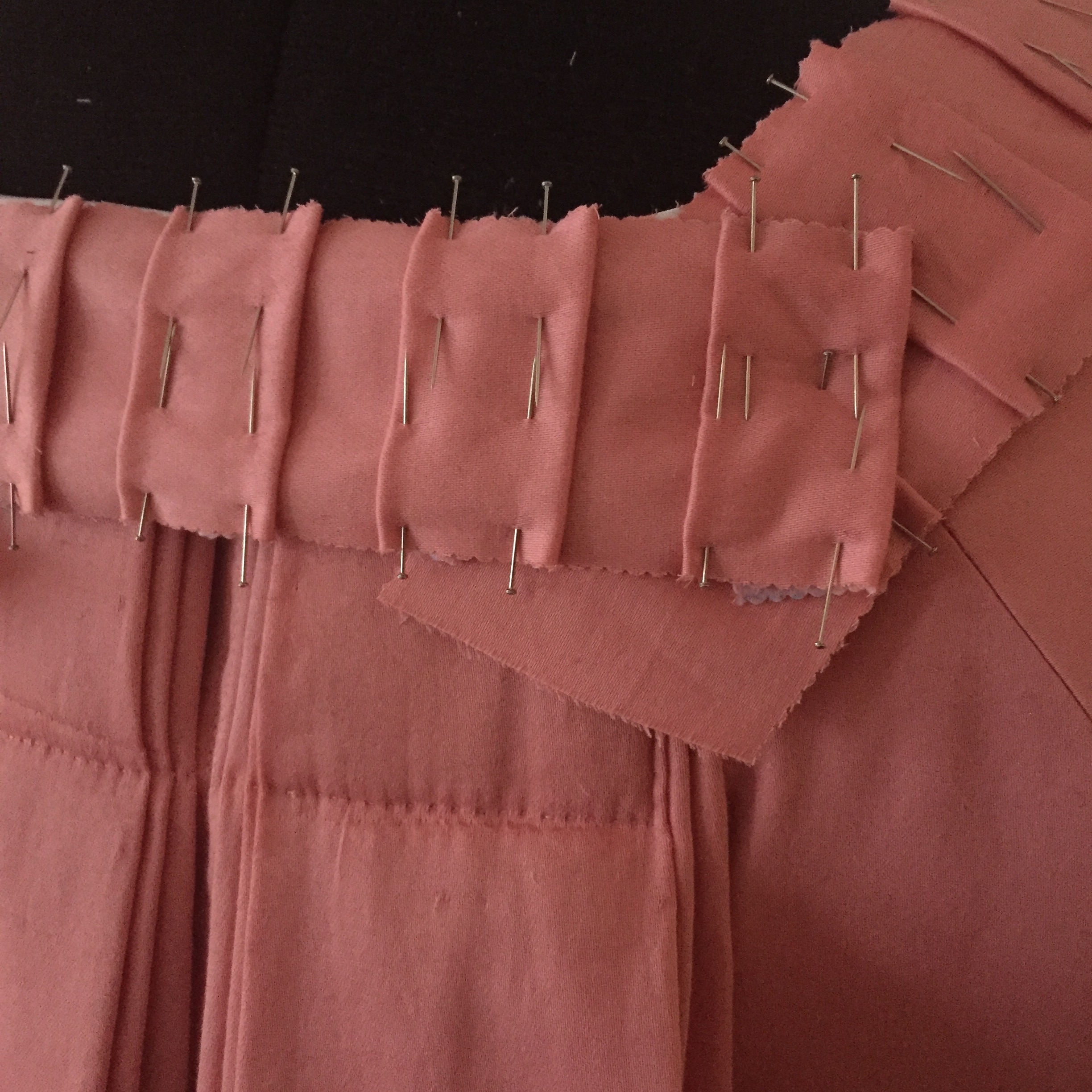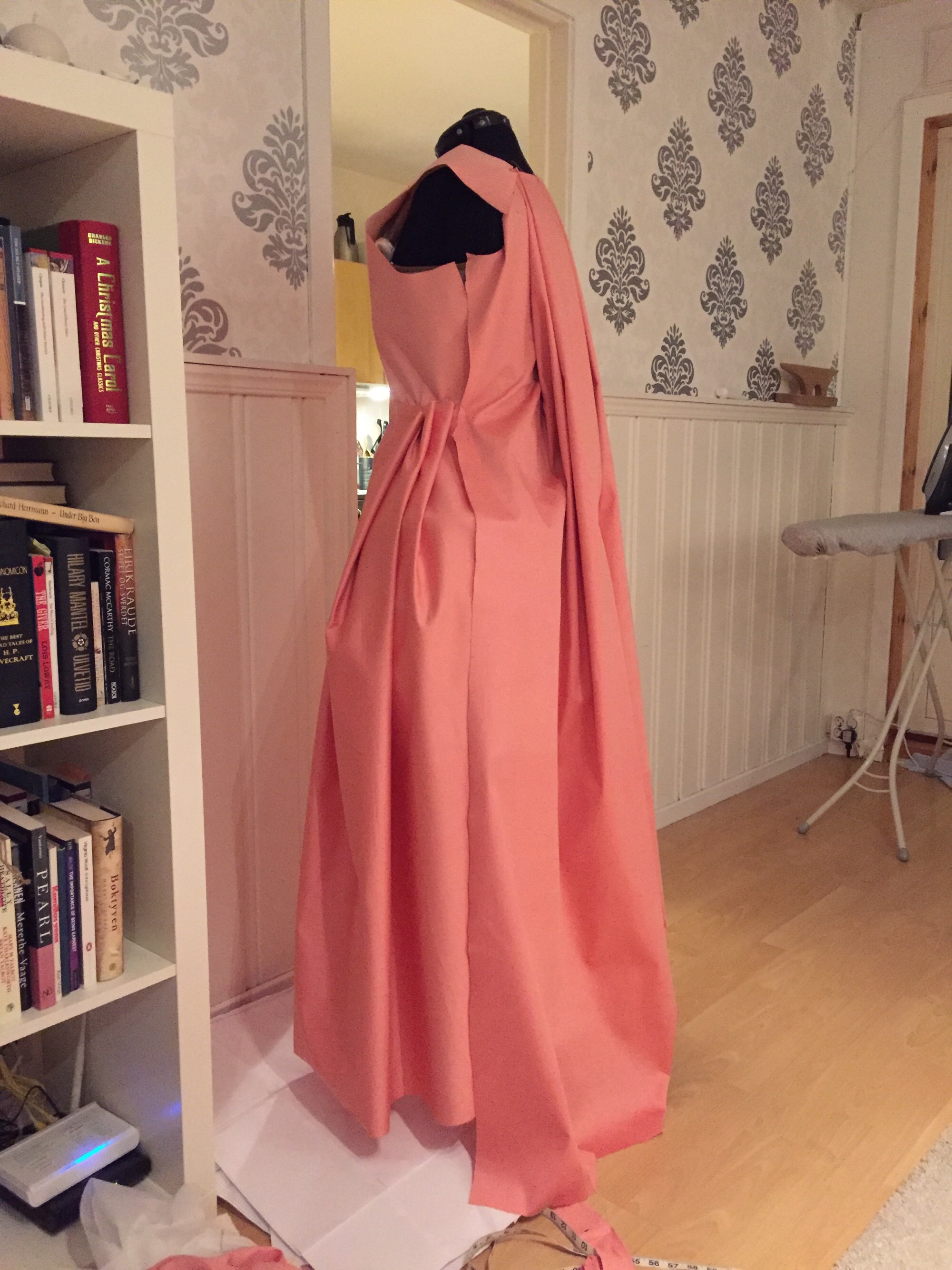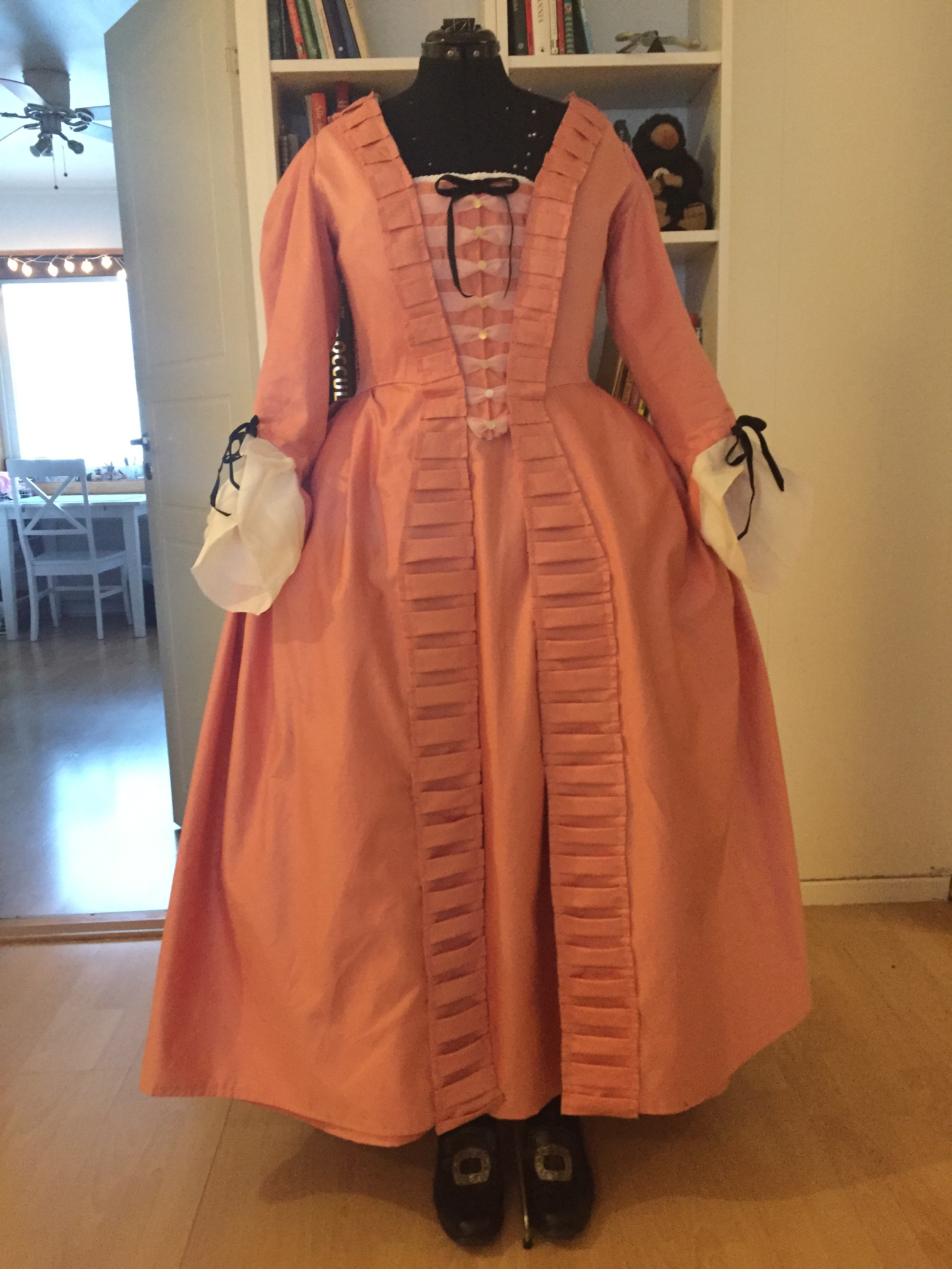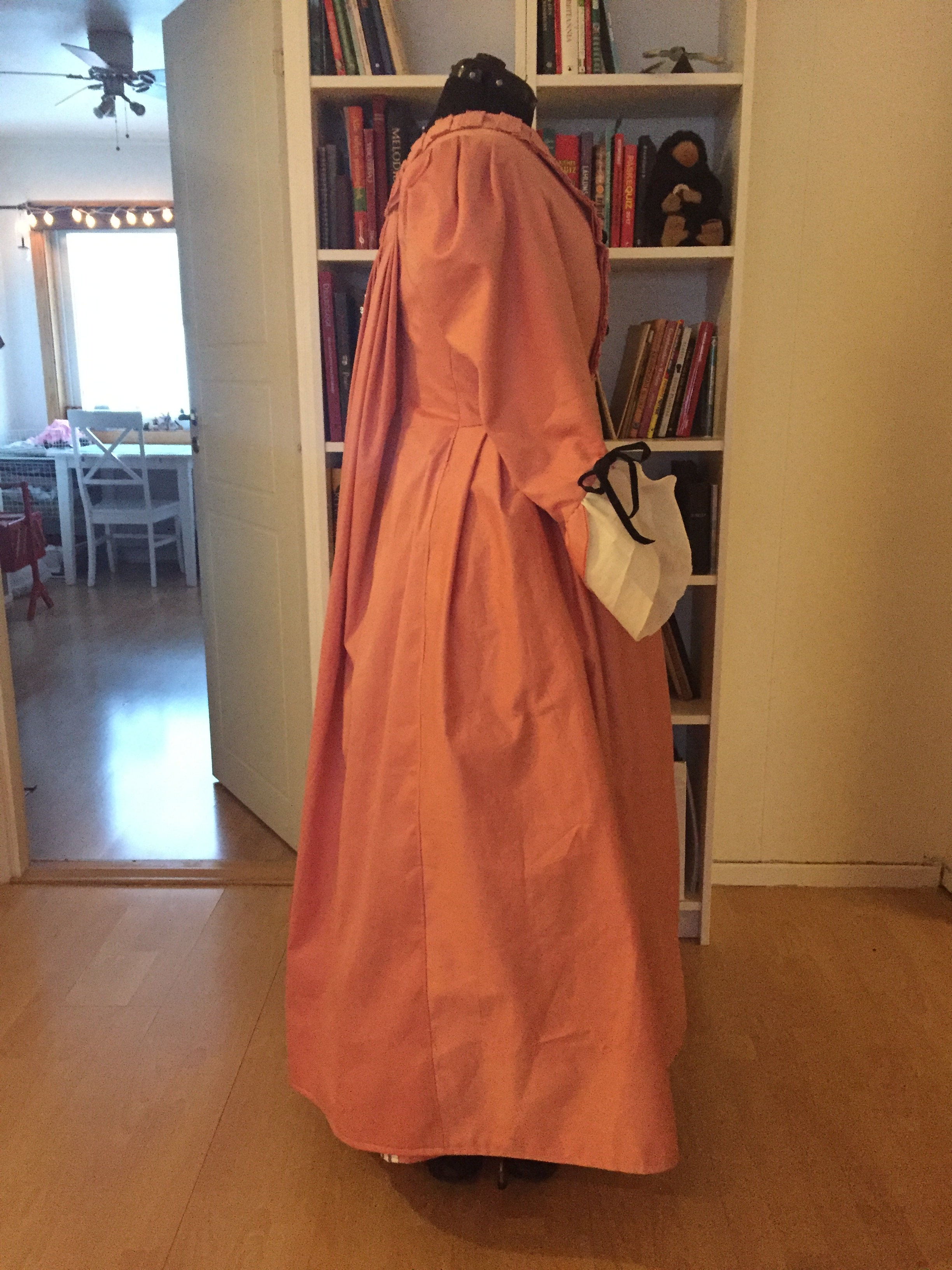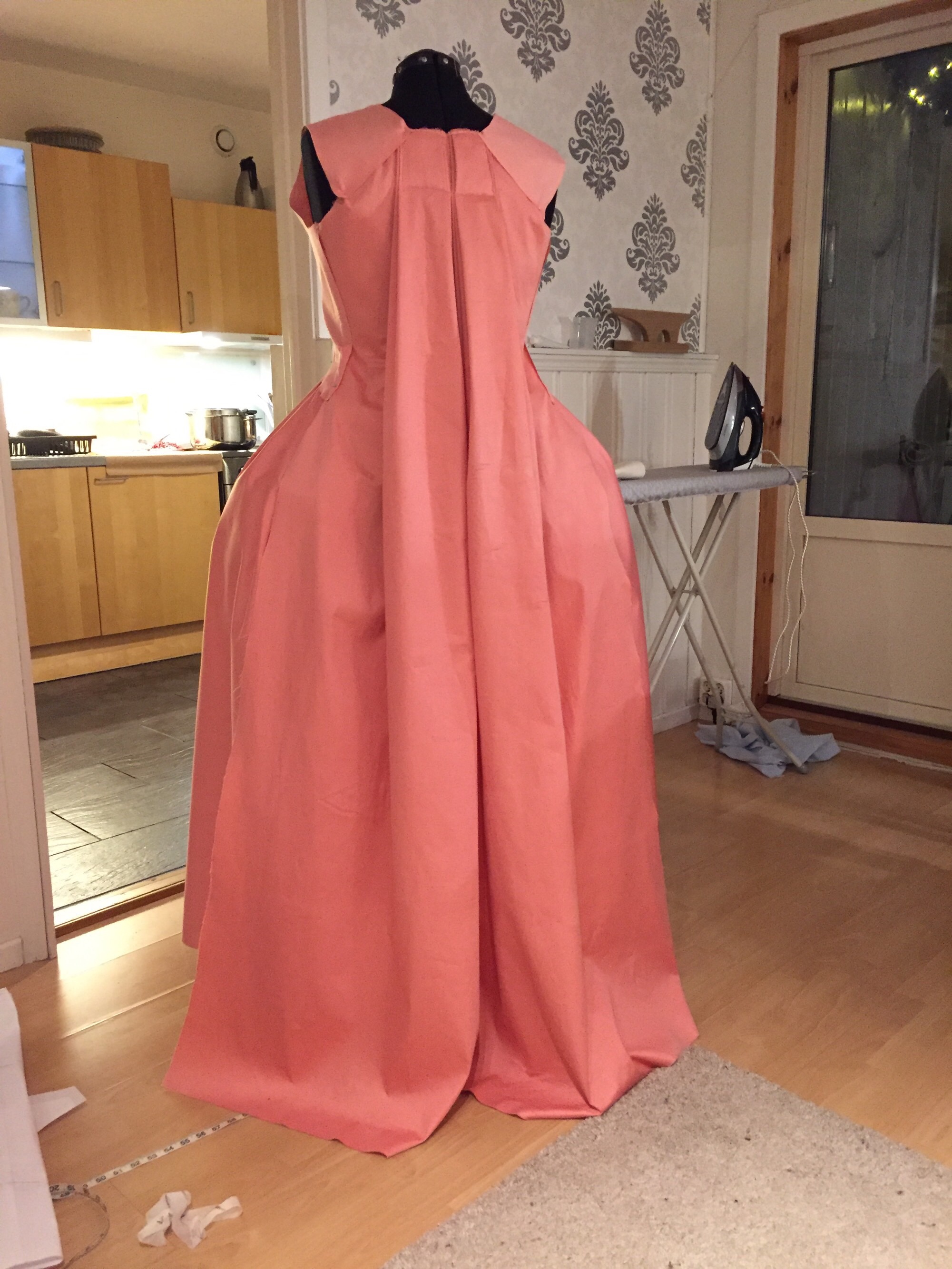 These dresses have an opening up the back on the inside, “behind” the big back pleats so to say. This makes the width of the bodice somewhat adjustable, and is usually closed with either ties or lacing. I opted for ties.