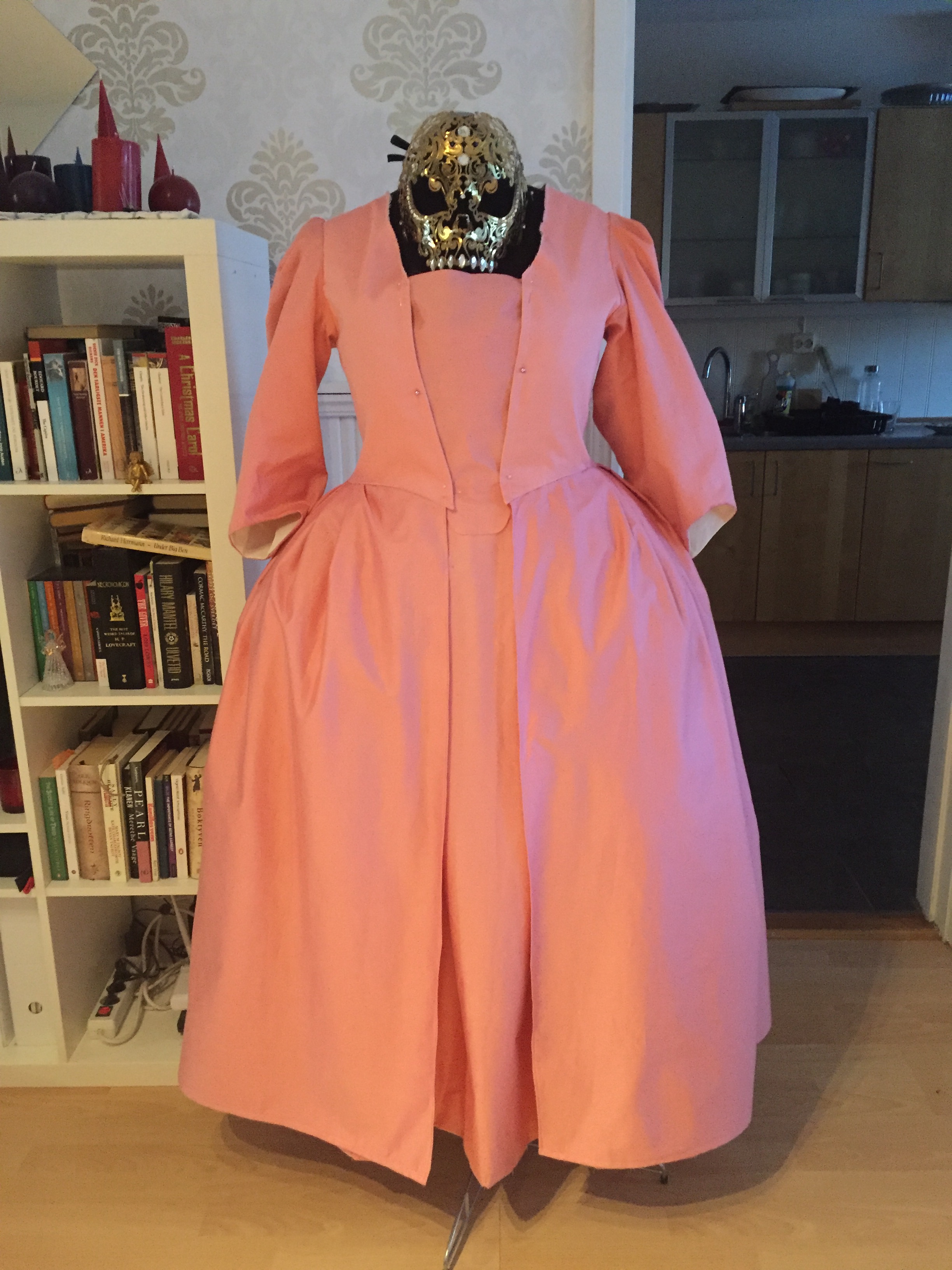 I settled on this gown, from Northern Ireland, made from pink silk with self-fabric decoration and a buttoned up stomacher. The stomacher makes me think that the artist had seen this gown, or one very similar to it, himself. I used a mix of patterns and instructions from a variety of sources, but mainly Reconstructing History’s pattern RH821 and Janet Arnold’s Patterns of Fashion 1.