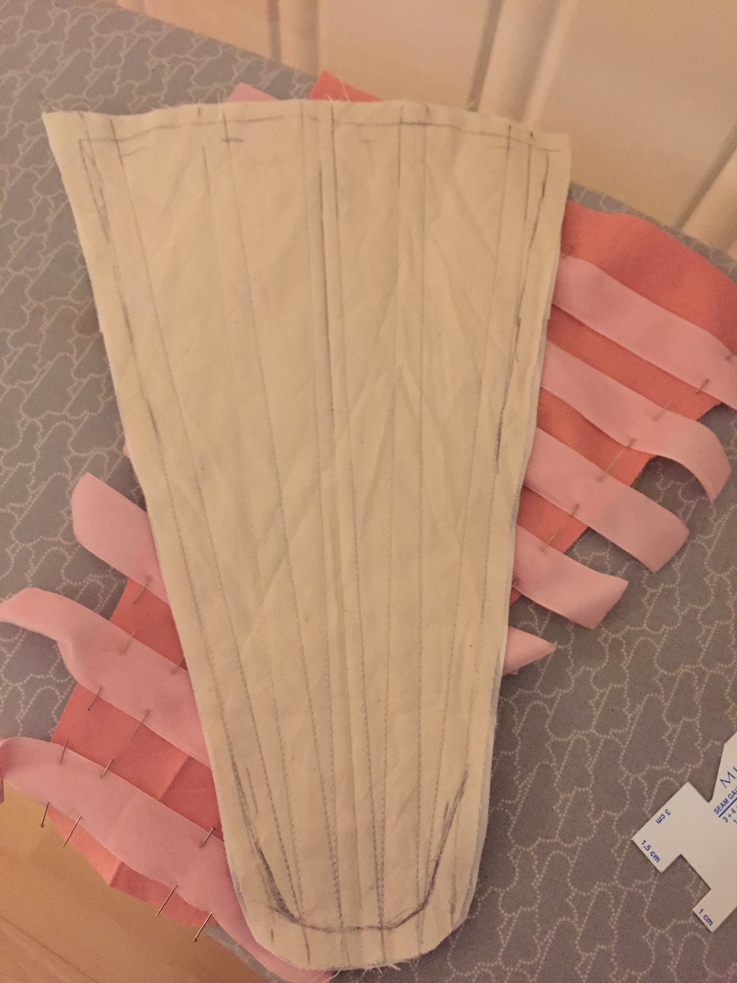 I made the stomacher by lining the striped satin with cotton canvas, and making boning channels. I then stitched the pink fabric to it around the edges, right sides together, leaving the top open, turned and pressed. I inserted the boning (synthetic whalebone), folded the raw edges in and topstitched in place. I then decorated the pink side with some velvet ribbons I had laying around (… I actually have a lot of that around the house. If you have a good idea as to what I can make with 25 m of pink velvet ribbon, give me a shout!), as well as some buttons, and topped it all off with a neat little row of lace at the top, to make it look as if I have a very ruffled, lacy chemise underneath, that is juuuust peaking out over the top.