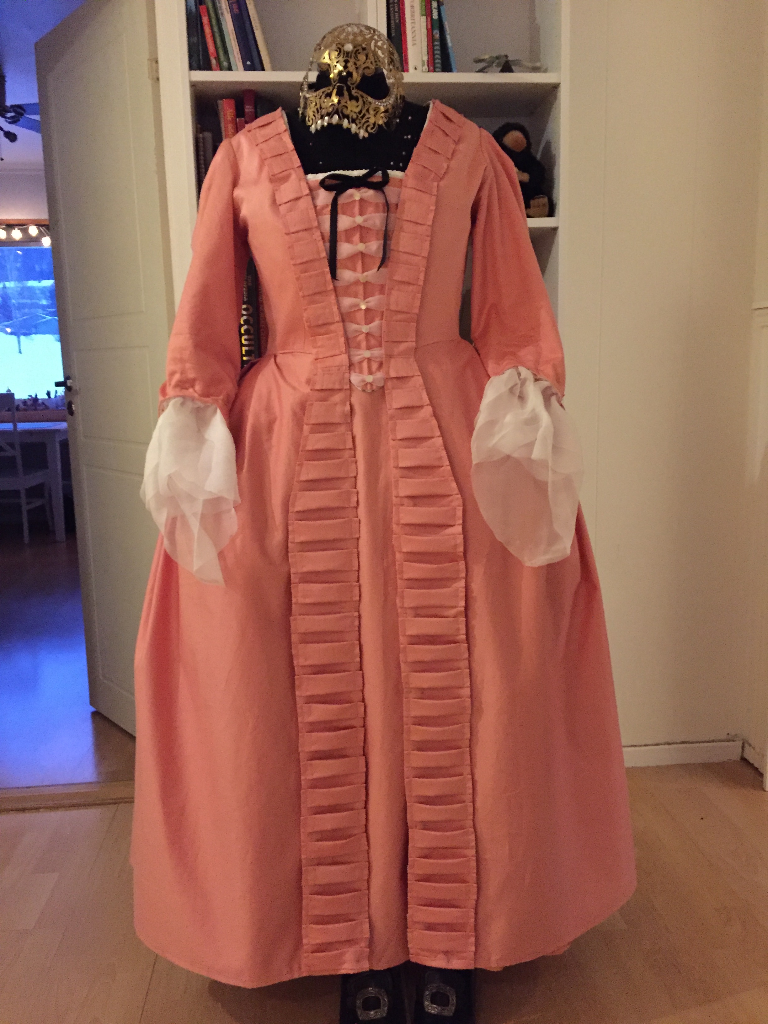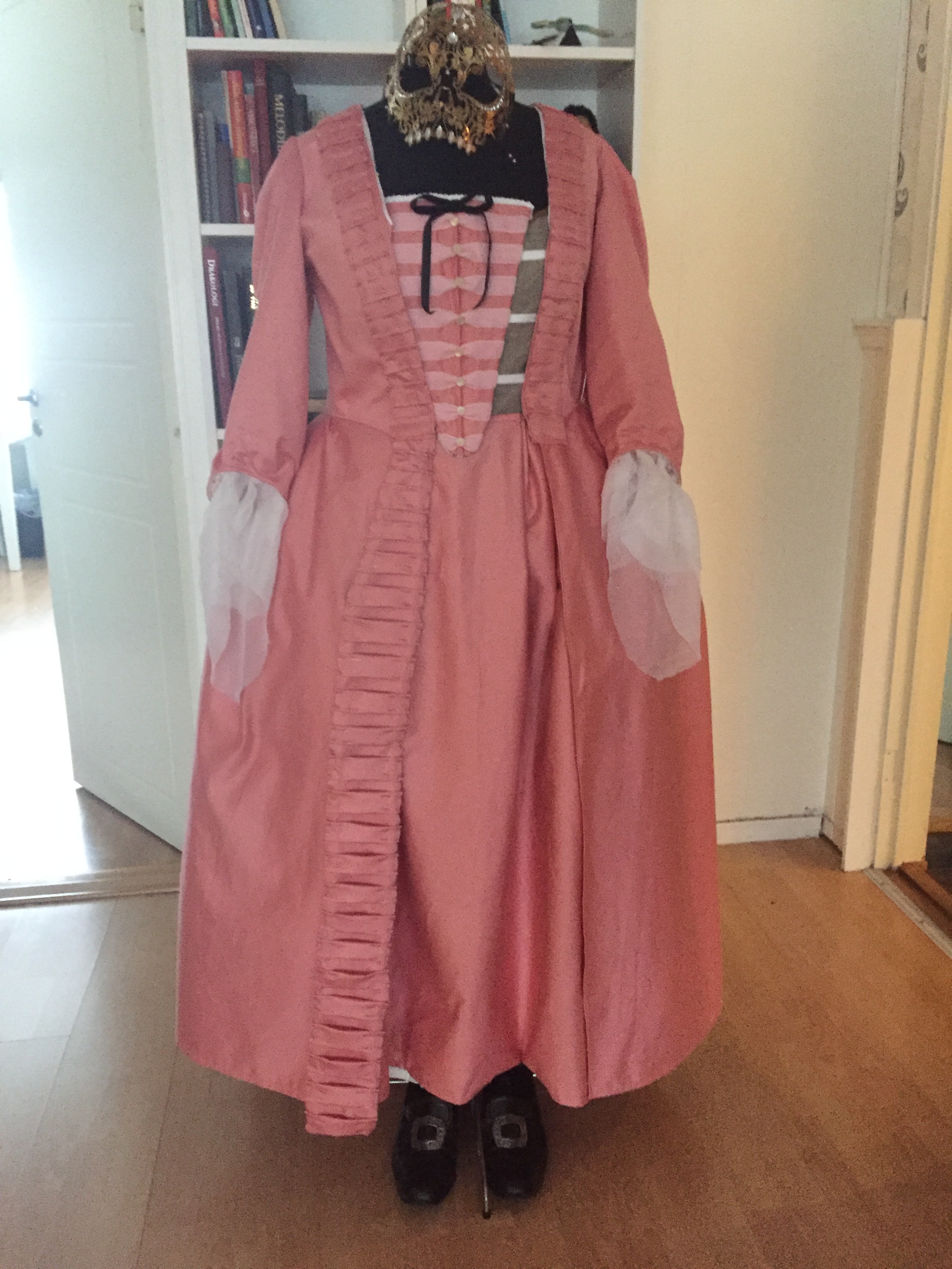I was really pleased with how this dress worked out. It was also a really comfortable thing to wear. I put it on around 17:00, and was home and undressed by approximately 1:30 in the morning. By then my feet were a little sore, but apart from that, I was completely comfortable. The stays make moving and dancing easy, the dress was short enough to allow me to dance and walk and ascend staircases without any hassle, and the sleeves gave room for movement. The petticoat was tied on, but the stomacher was pinned to my stays, and the gown pinned to the stomacher, which worked a treat. I did not prick myself (or others), and they took the strain of the dress like champs!