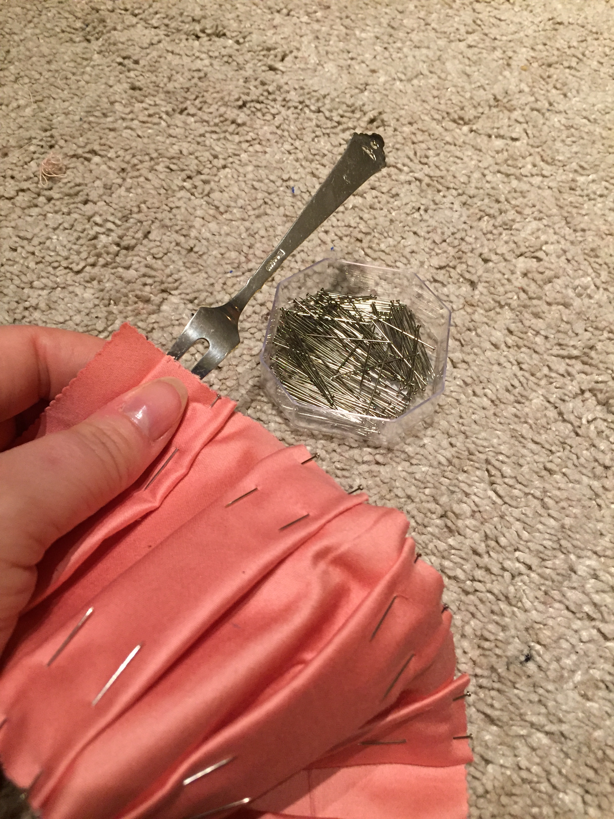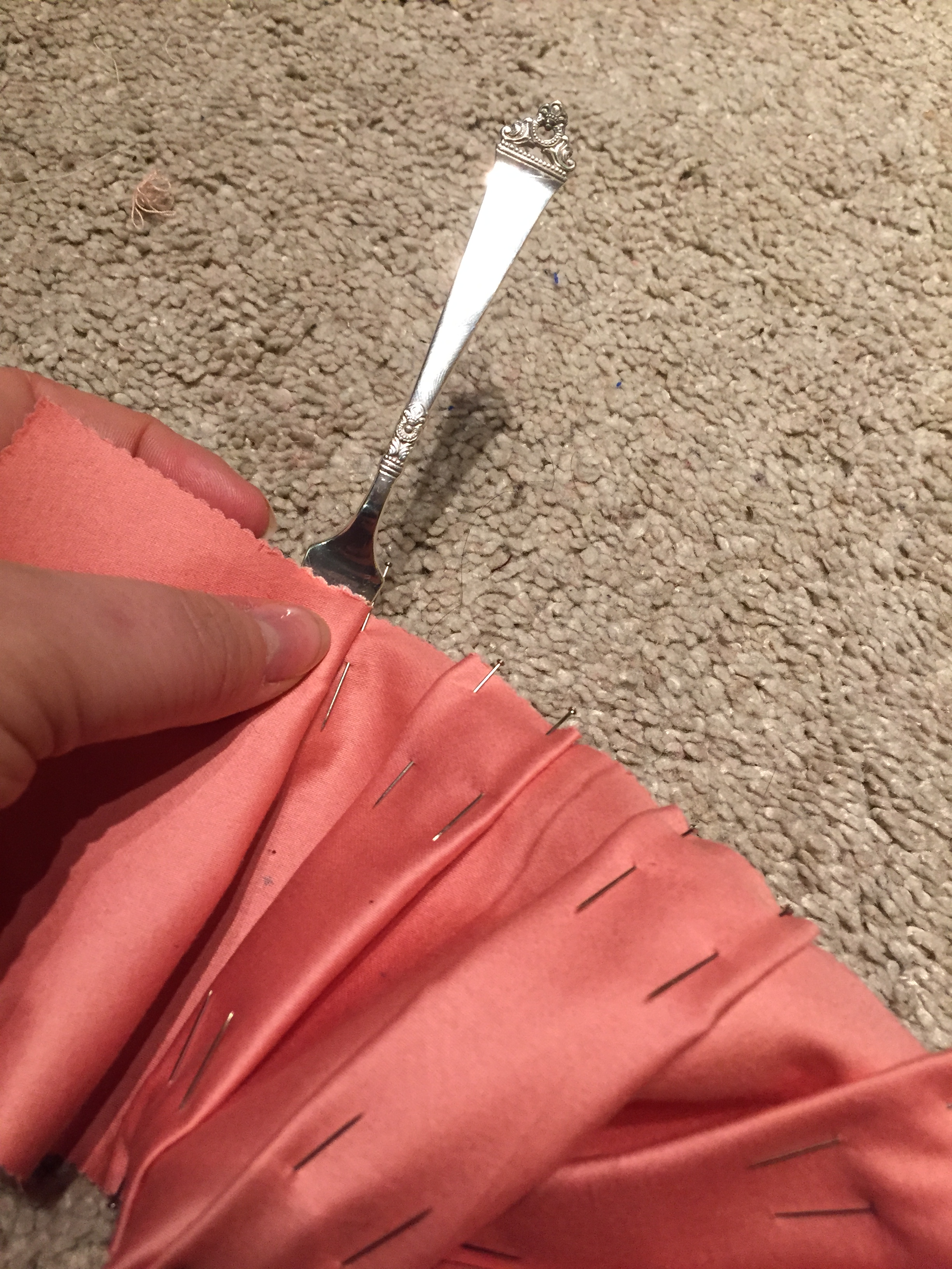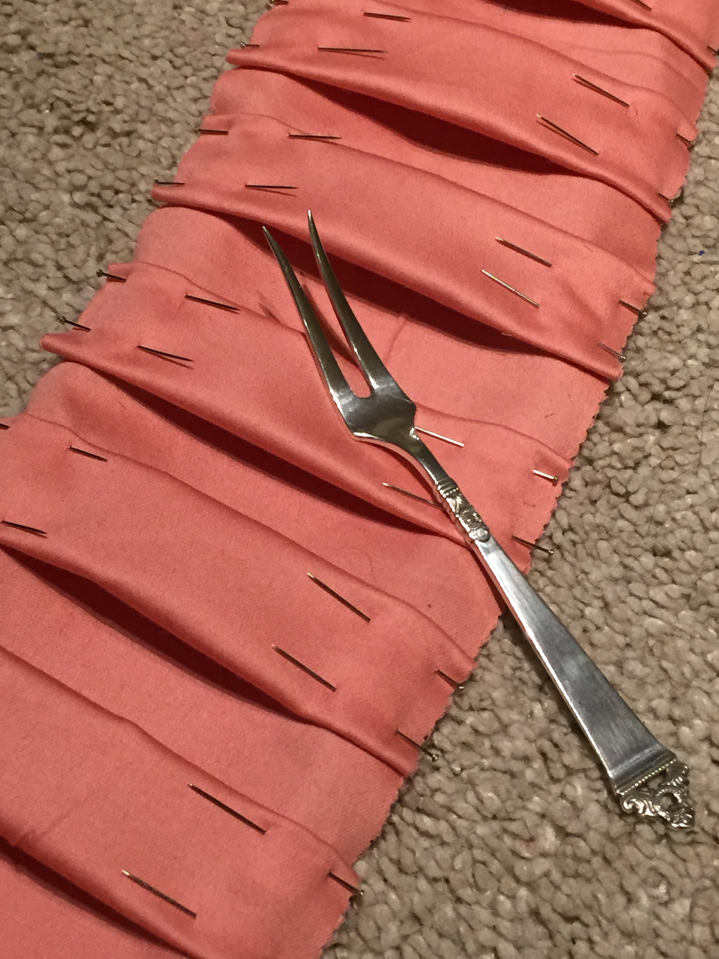 The way I chose to do it, was by fork. That’s right. Fork pleating. I’d read about it, and I wanted to try it. I used this youtube tutorial, and experimented a bit, and I’m very pleased with the result!