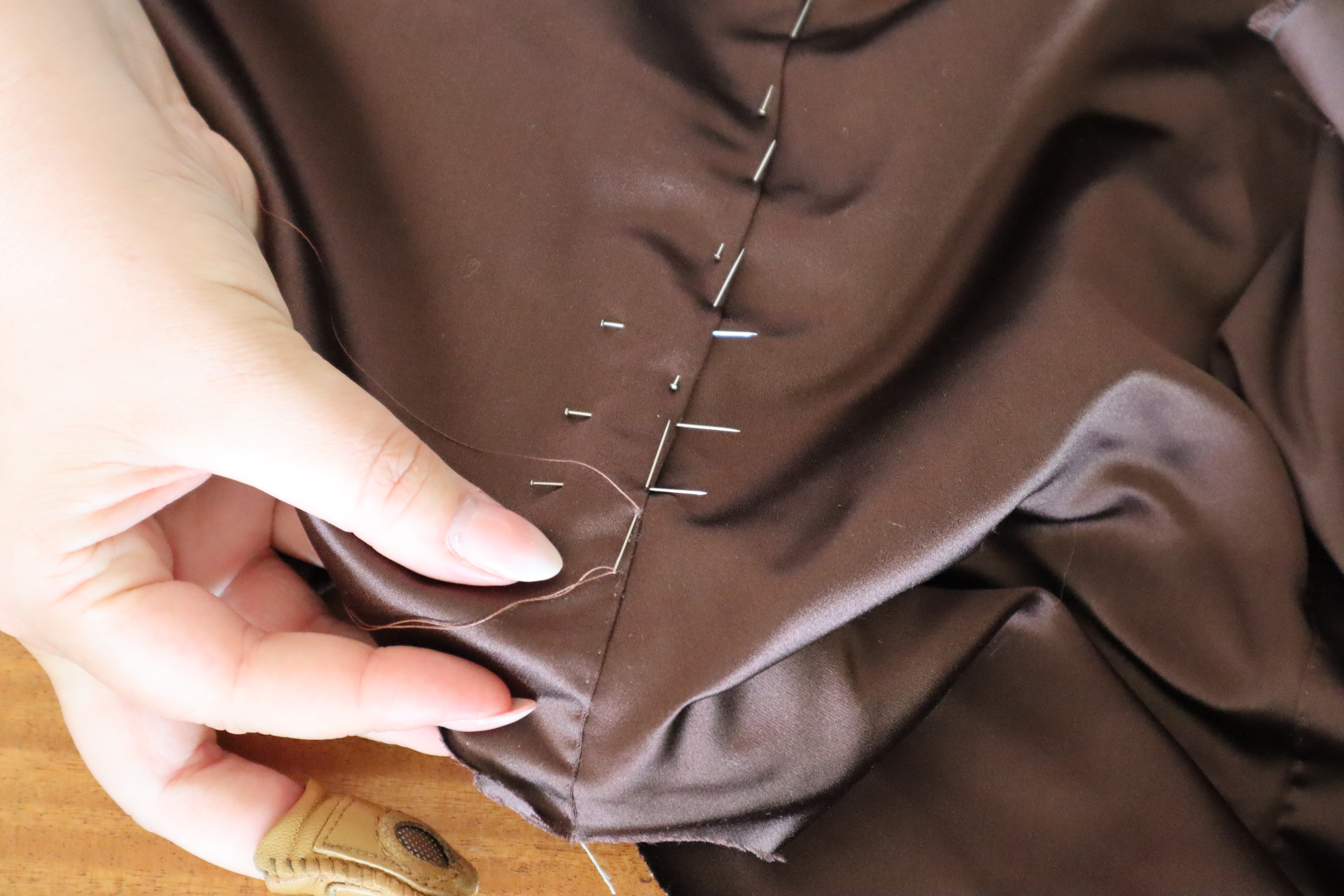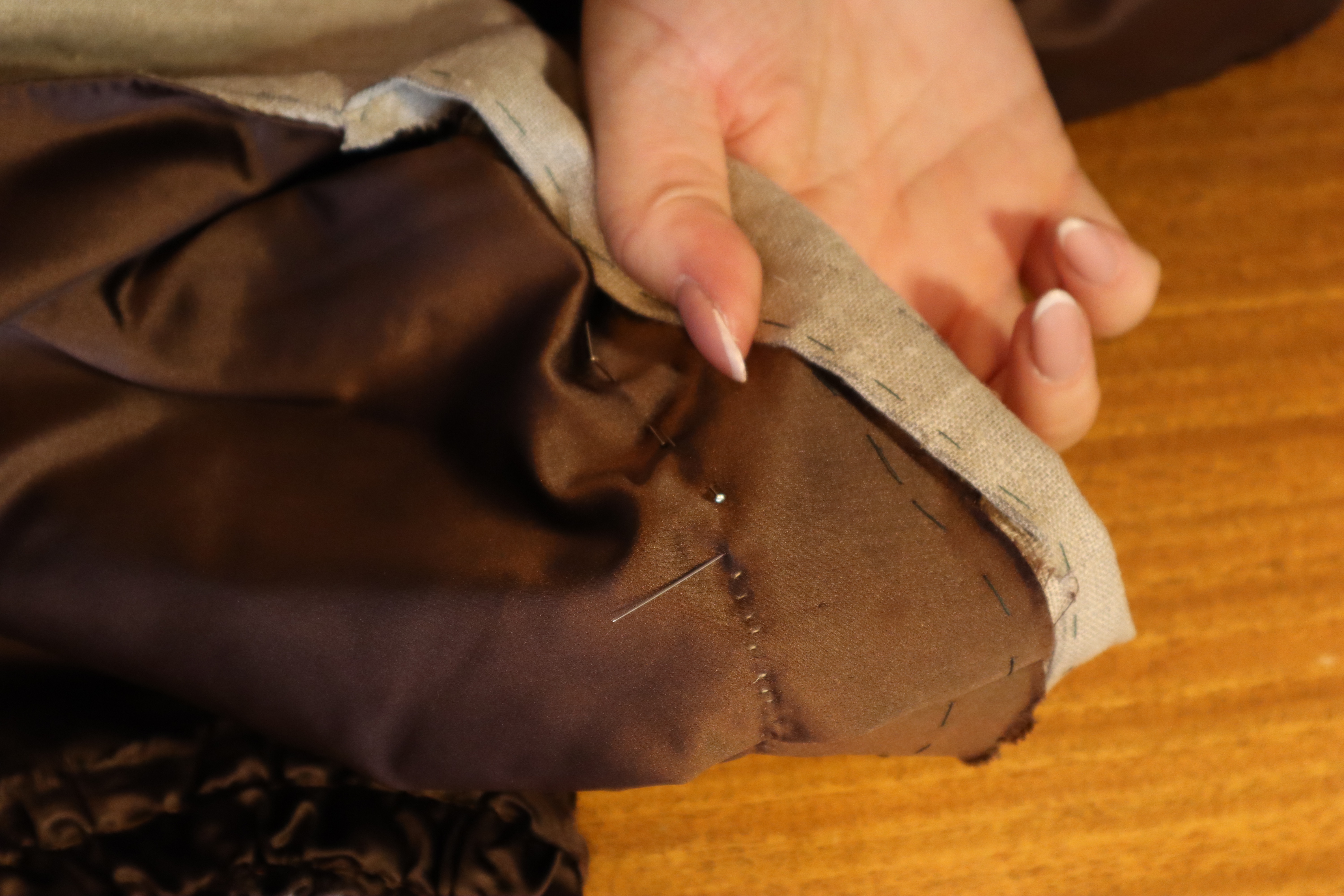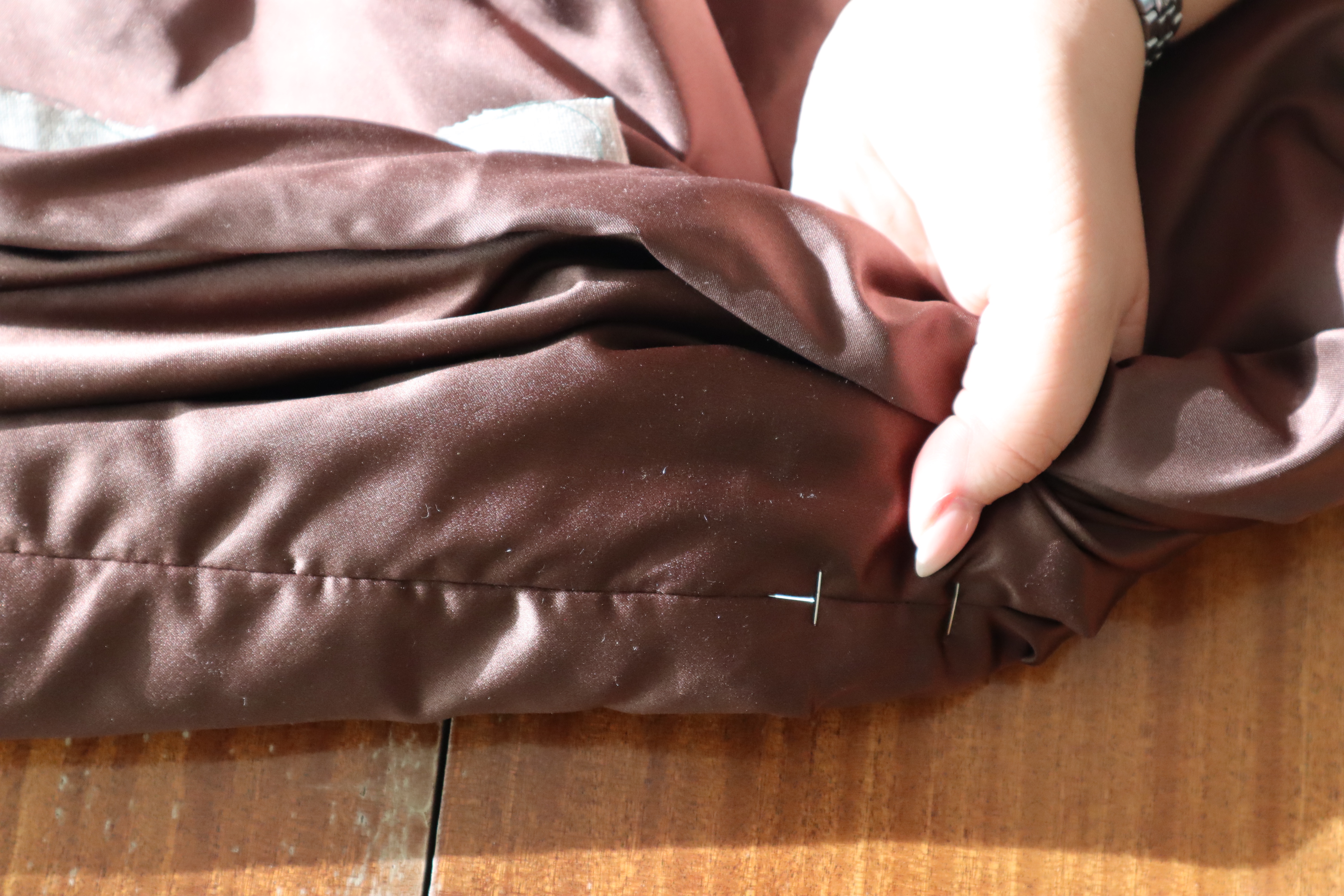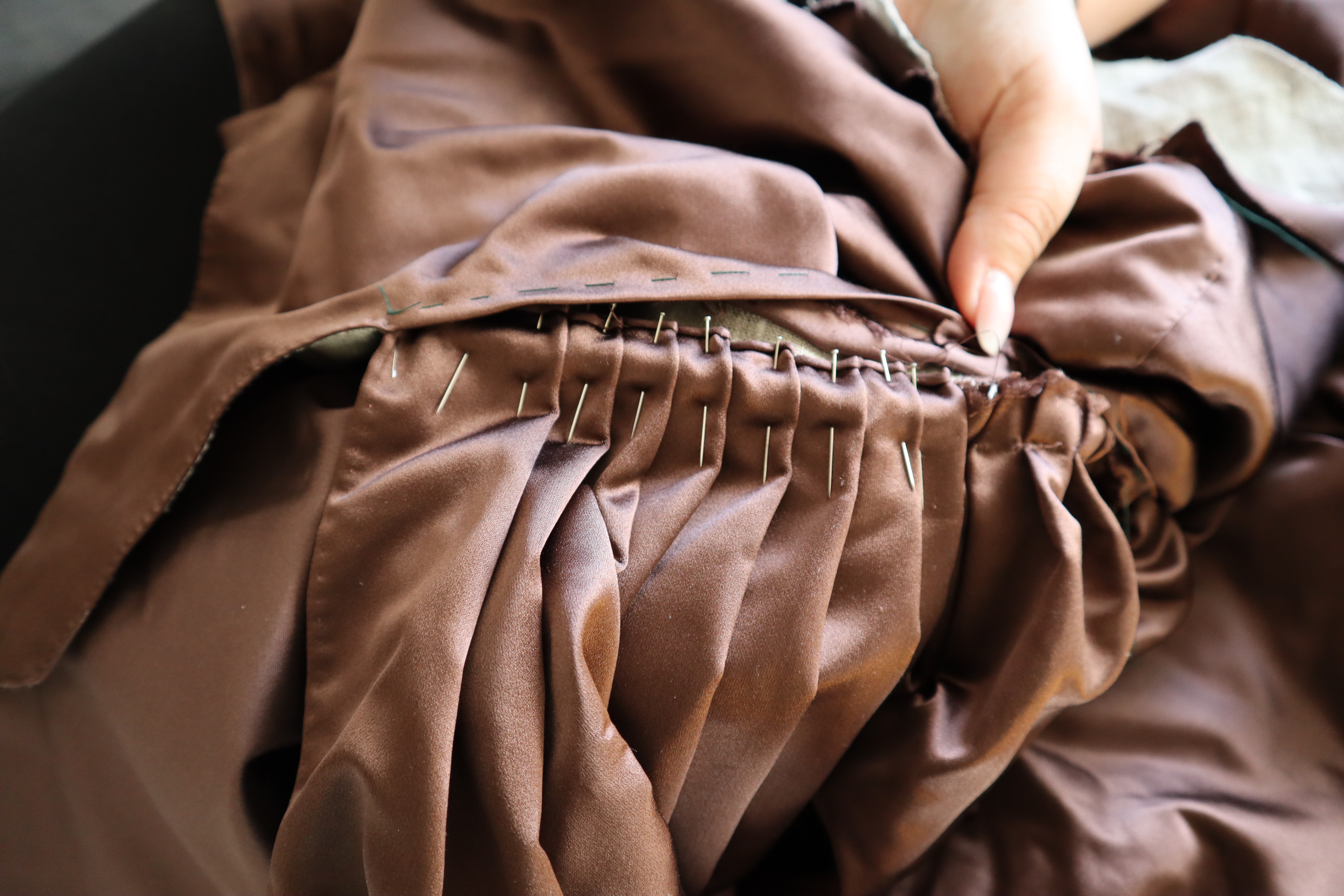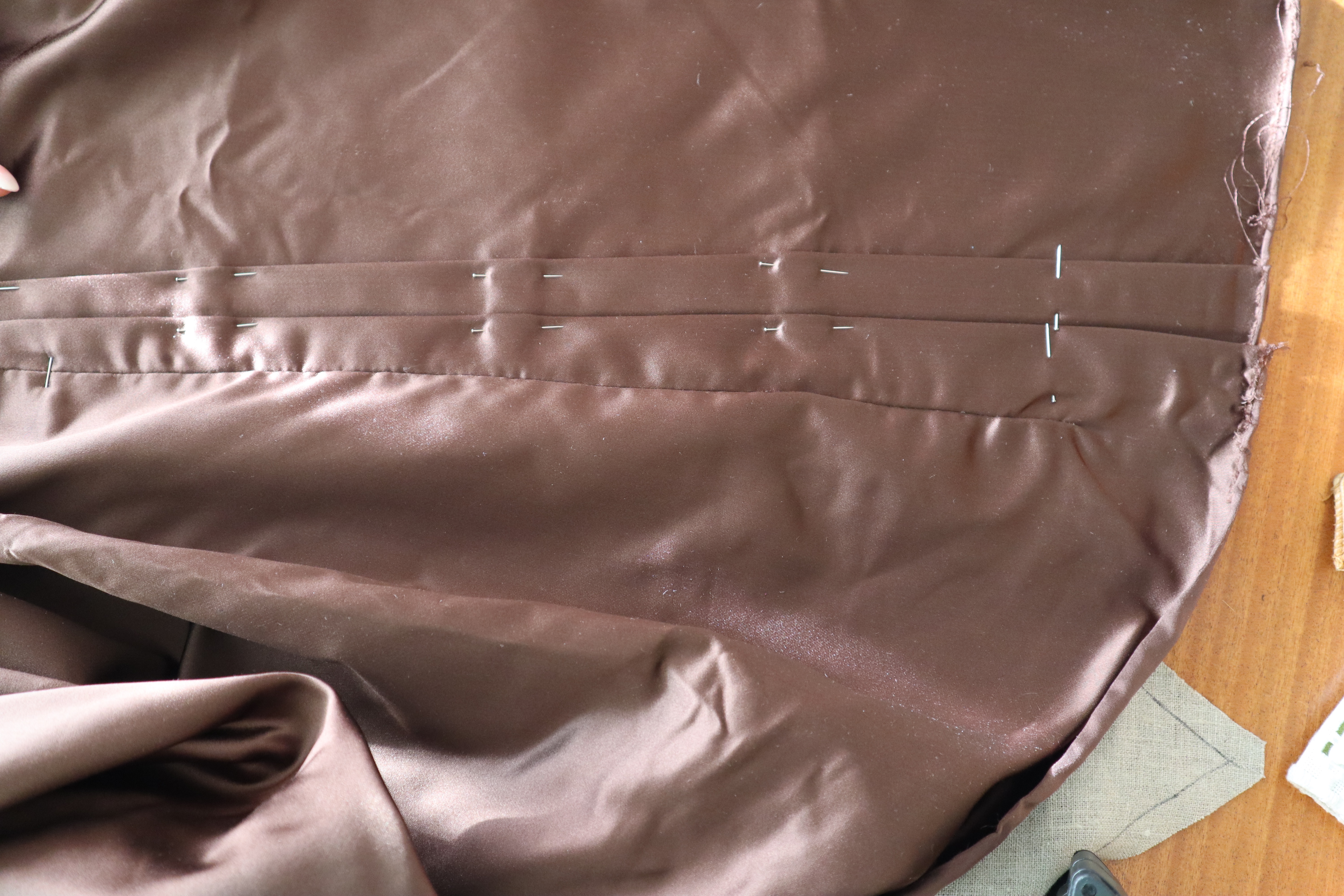 Marking c. 5 cm up from the bottom of the lining, I made sure to pin the pleats to the lining above that mark, and only to themselves below it. This is to make the gown flow nicely down my back and over my butt.