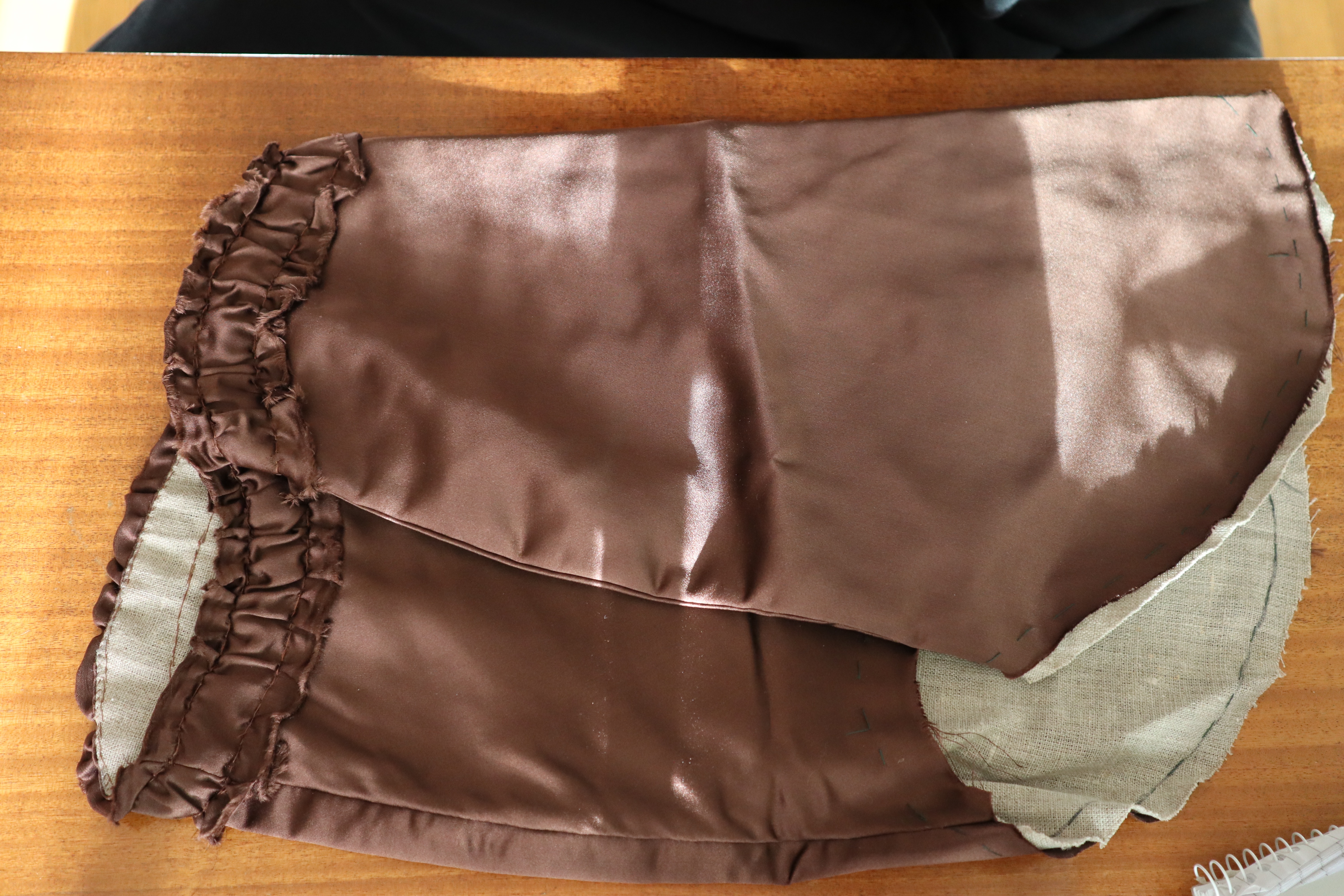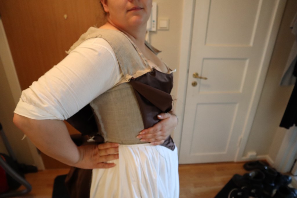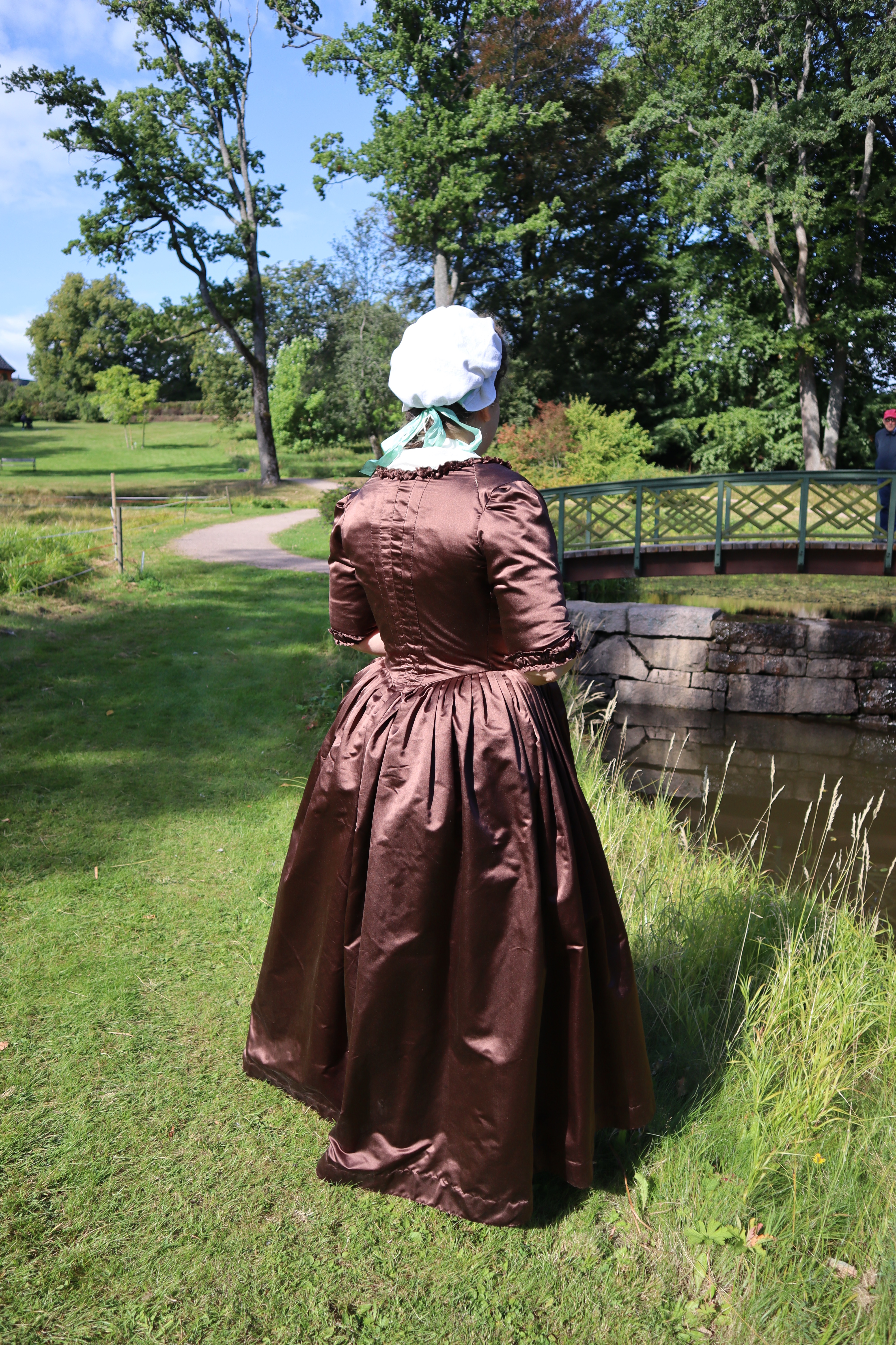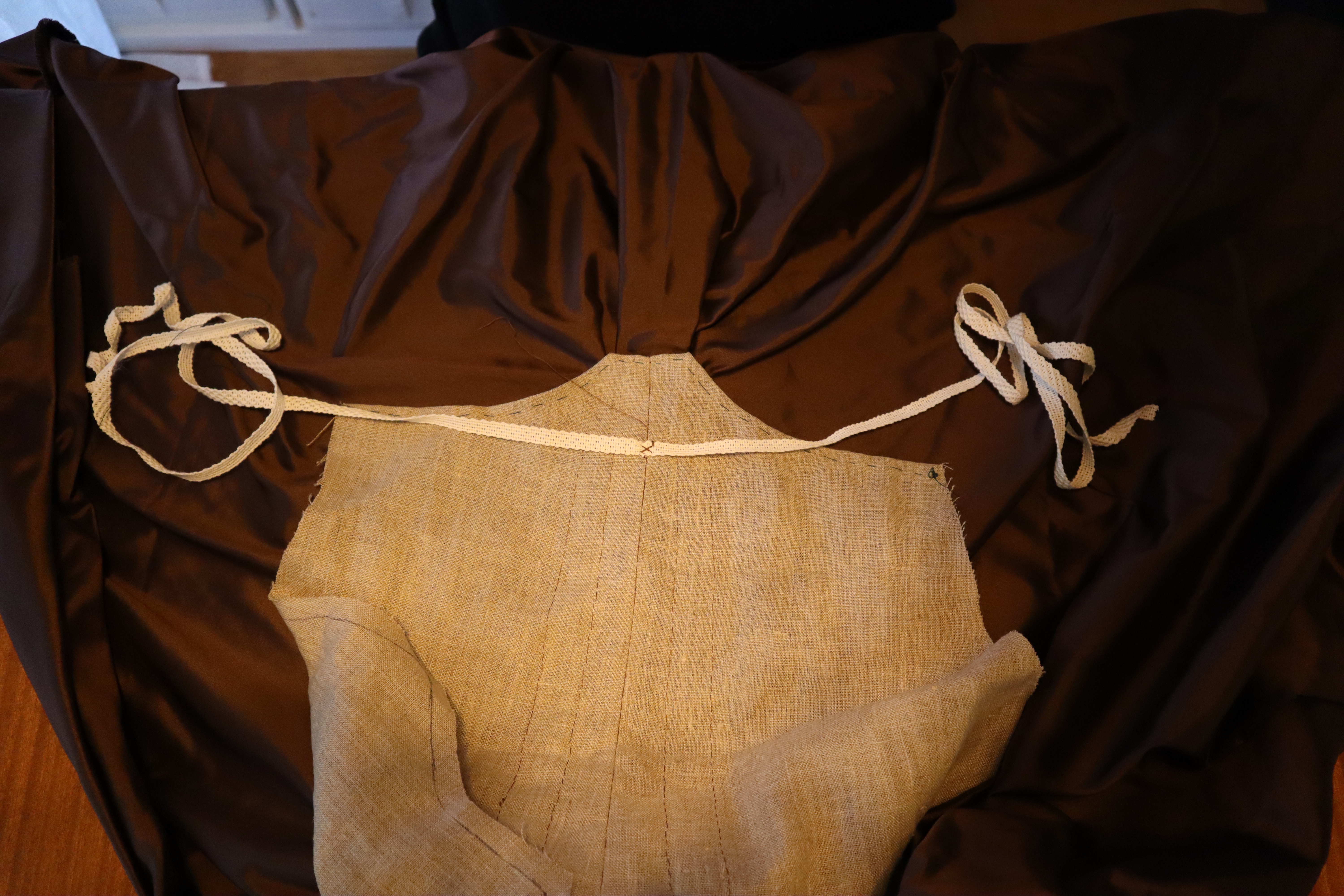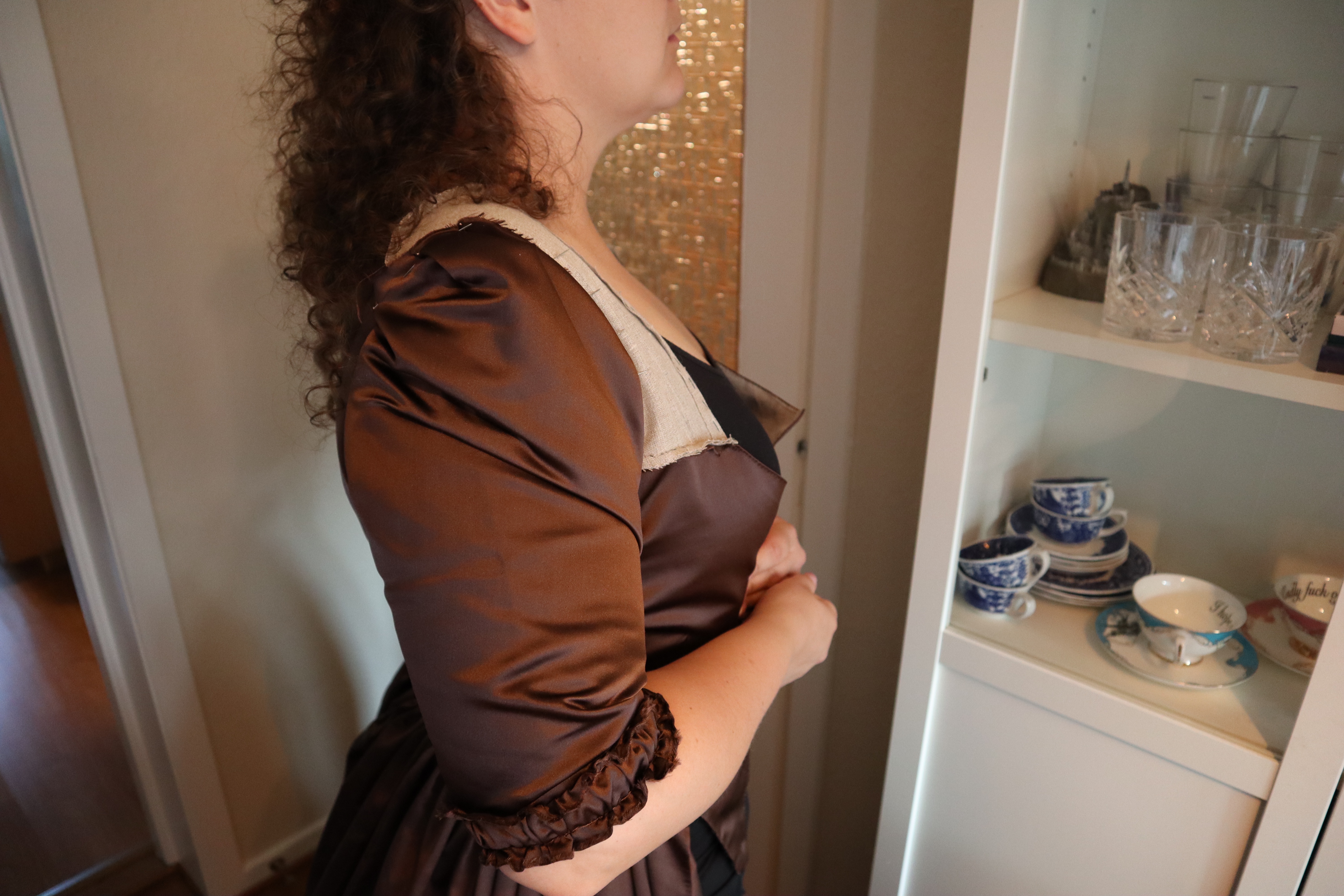 However, there is one that is just called “gown” in the inventory, “Gown of brown silk”. I don’t know if this means the gown was more simply made, and intended for everyday wear, or if the person who wrote the inventory down just forgot to add “night” to this gown, but I’m going to go with the former, as that allowes me to explore and experiment more…