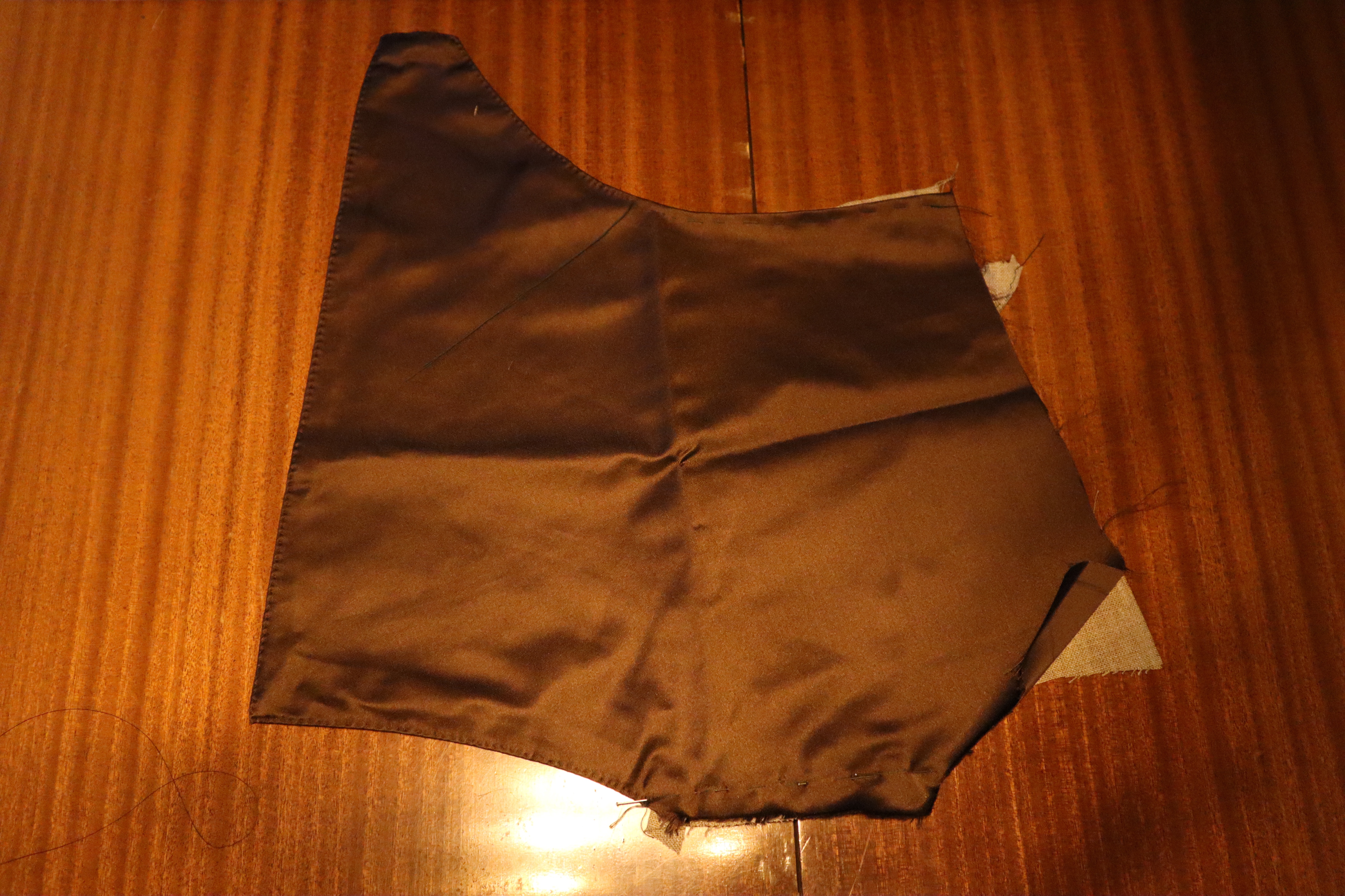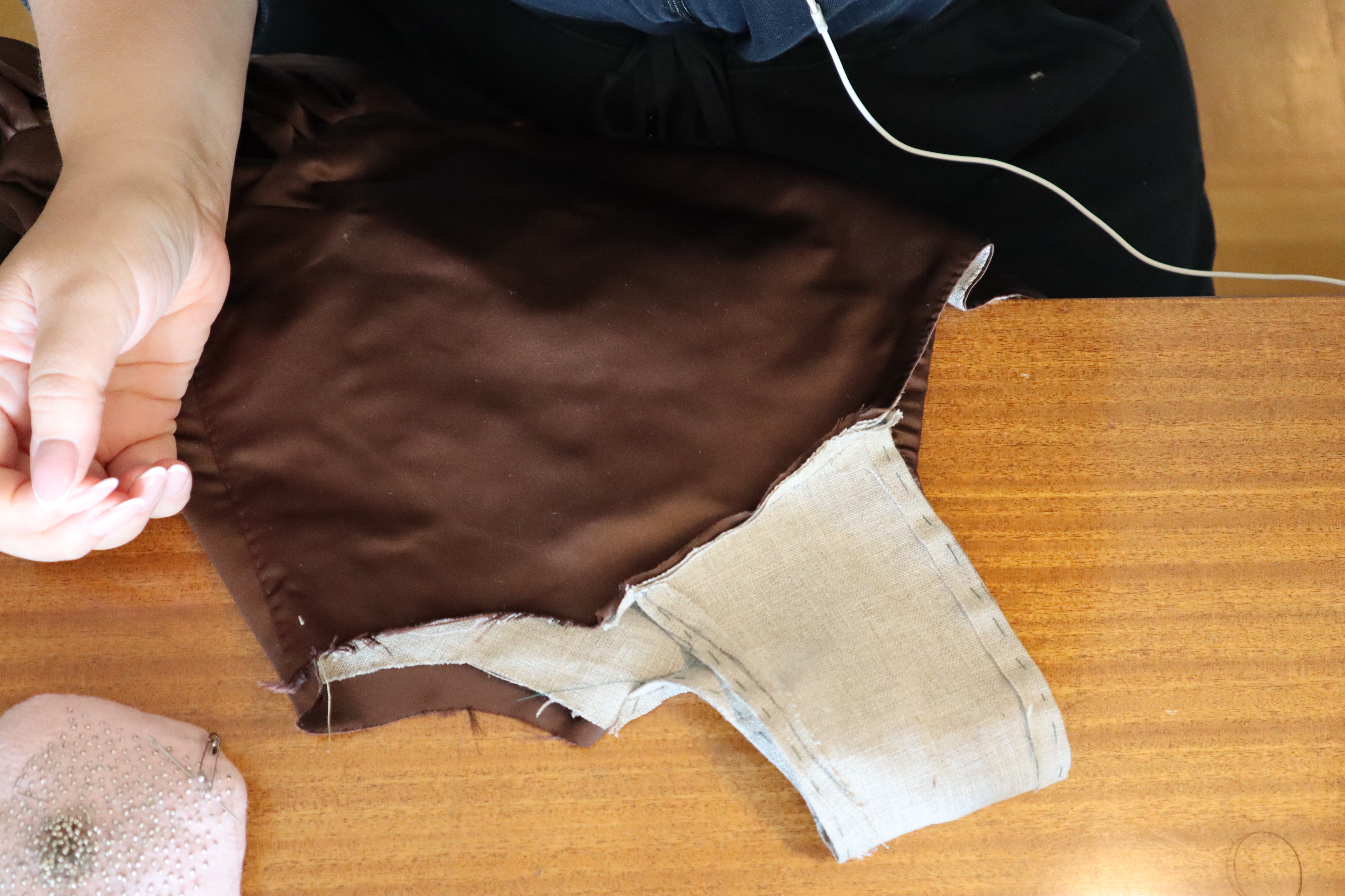 The lining is stitched together from the inside using small hem stitches, then the fashion fabric was lapped over the raw edges and stitched in place using a small prick stitch.