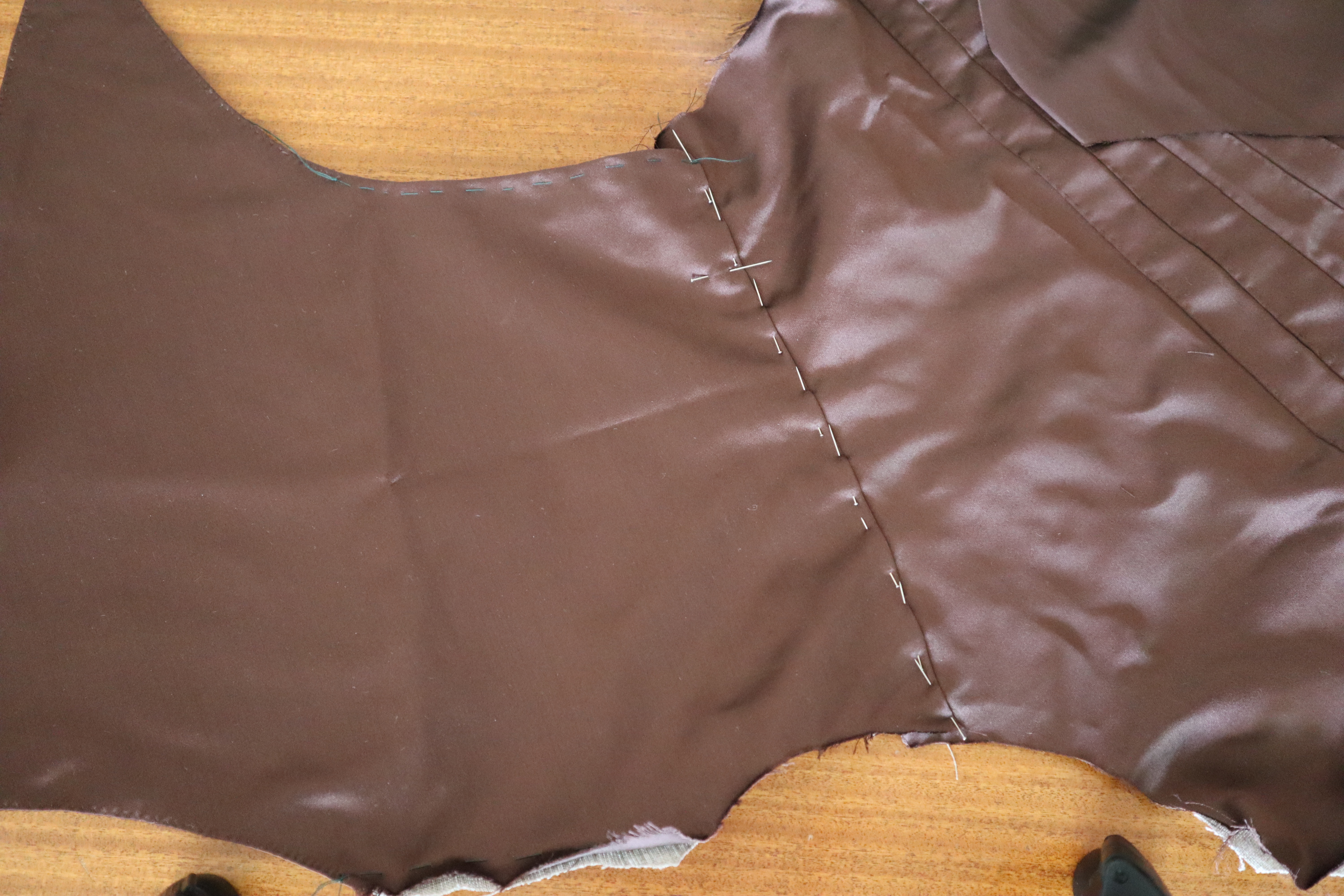 Pinning the bodice together with the shoulder strap linings, I was able to try it on, and adjust the side seams. They were pretty good, which wasn’t that surprising, seeing as this is a tried and tested pattern by now, but I was happy to see that nonetheless.