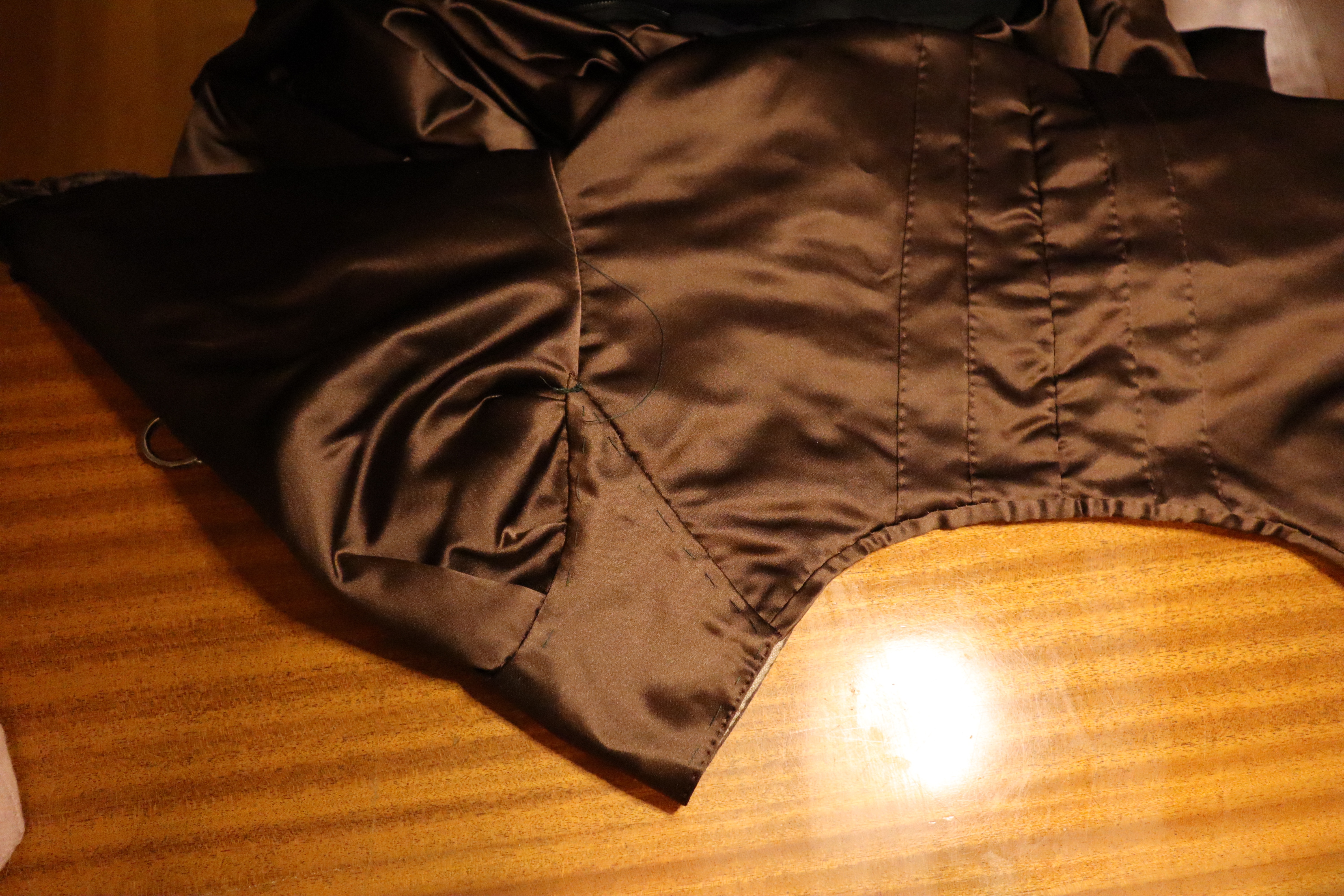 With the pleats done, I had way too much fabric in the back bodice, so marking a line c. 1 cm below the curved bottom hem of the lining, I squared it out towards the sides of the fabric. I cut that squared out line, as well as along the side seam and down under the bodice lining. The last cut was made with my heart in my throat, I cut far enough to hide the cut under the outermost pleat, but not far enough to rip the fabric clean off. I even strenghtened the split with safety pins to reduce the risk of ripping and tearing.
