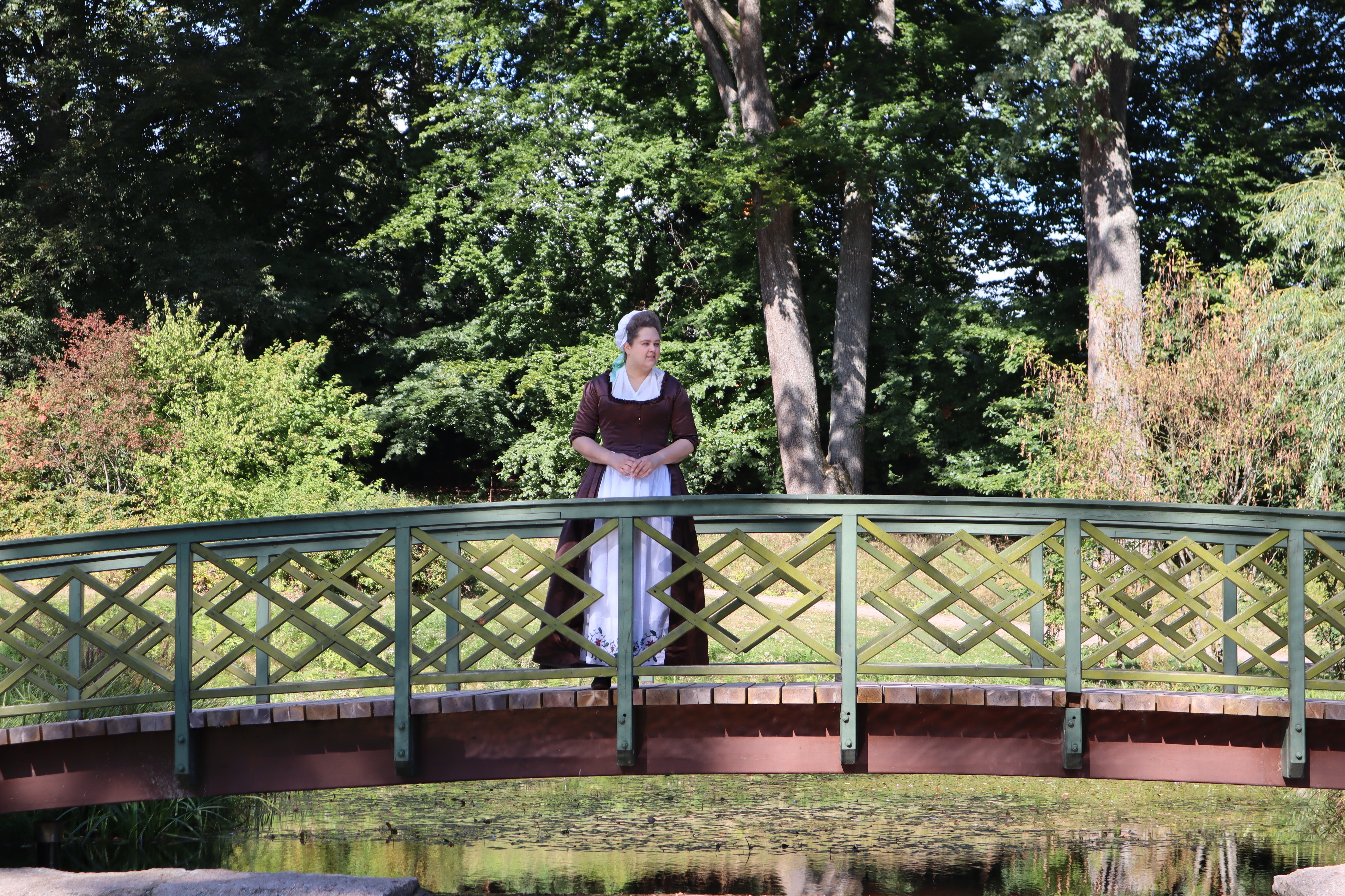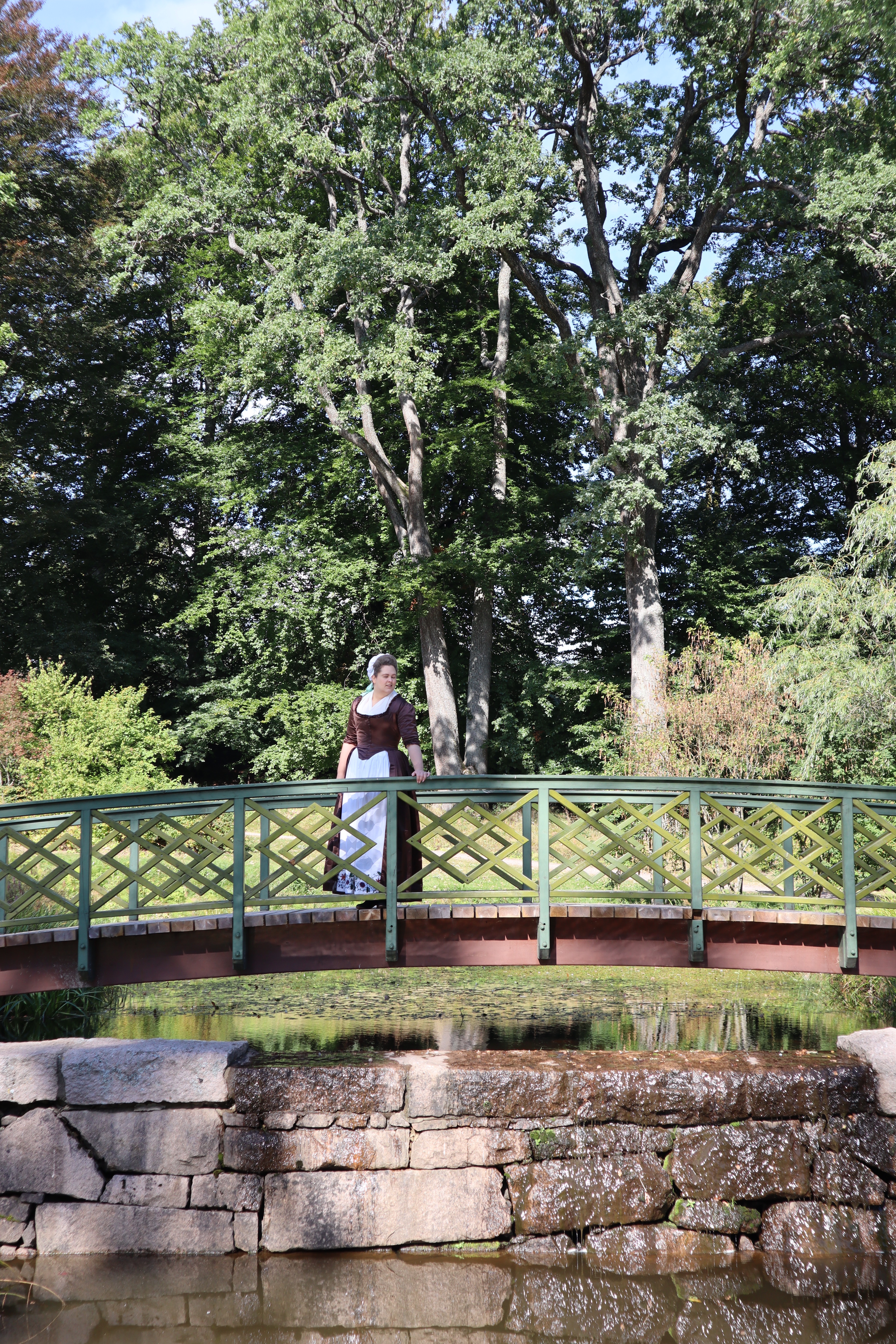 A little more self-fabric rouched trim around the neckline, and the dress is done! Happily, I have an 18th century English garden only 20 minutes from my home…