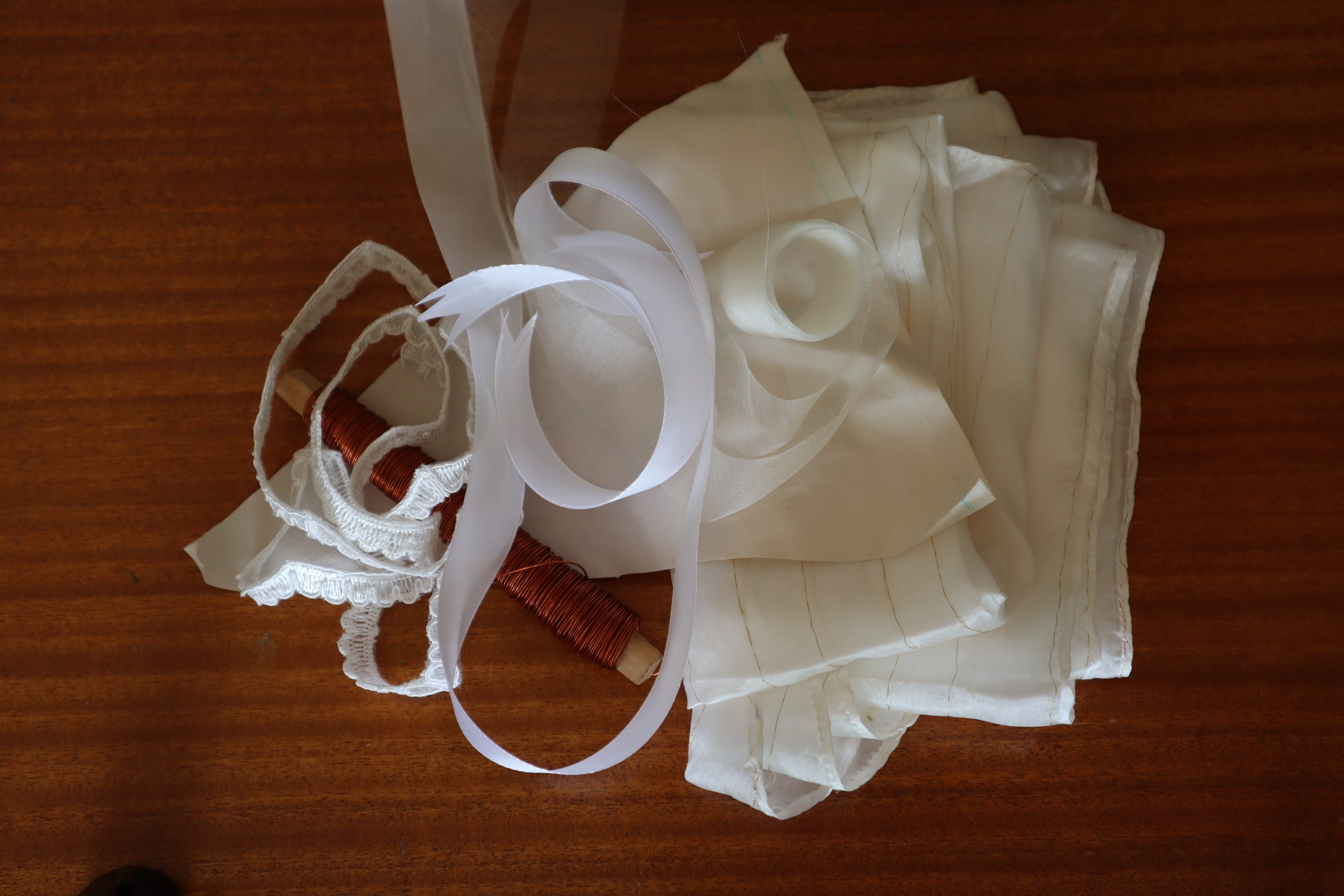 A triangular base, cut from white silk taffeta, two lengths of white silk organza, some copper wire for hobby use, some small pieces of ribbon, some left-over embroidered lace, and my silk veil from the Rowena costume! I loved the look of it, but I will probably never wear it as a veil again, it was way too heavy and slippery. This way, I can give it new life, and still enjoy the meters upon meters of gold stitches I made in it!