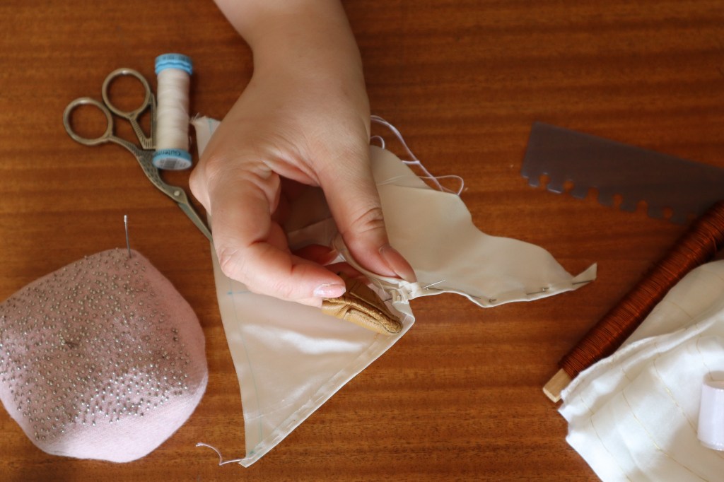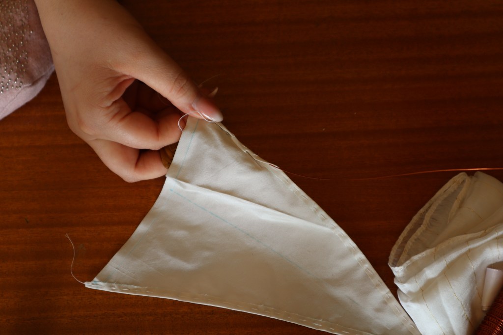 I started by folding all the edges of the silk triangle in, and basting them down. I then folded the edges over the copper wire, and stitched them down. This was fiddly, but I was happy with the result, the wire gave the base a lot of stability and sturdiness.