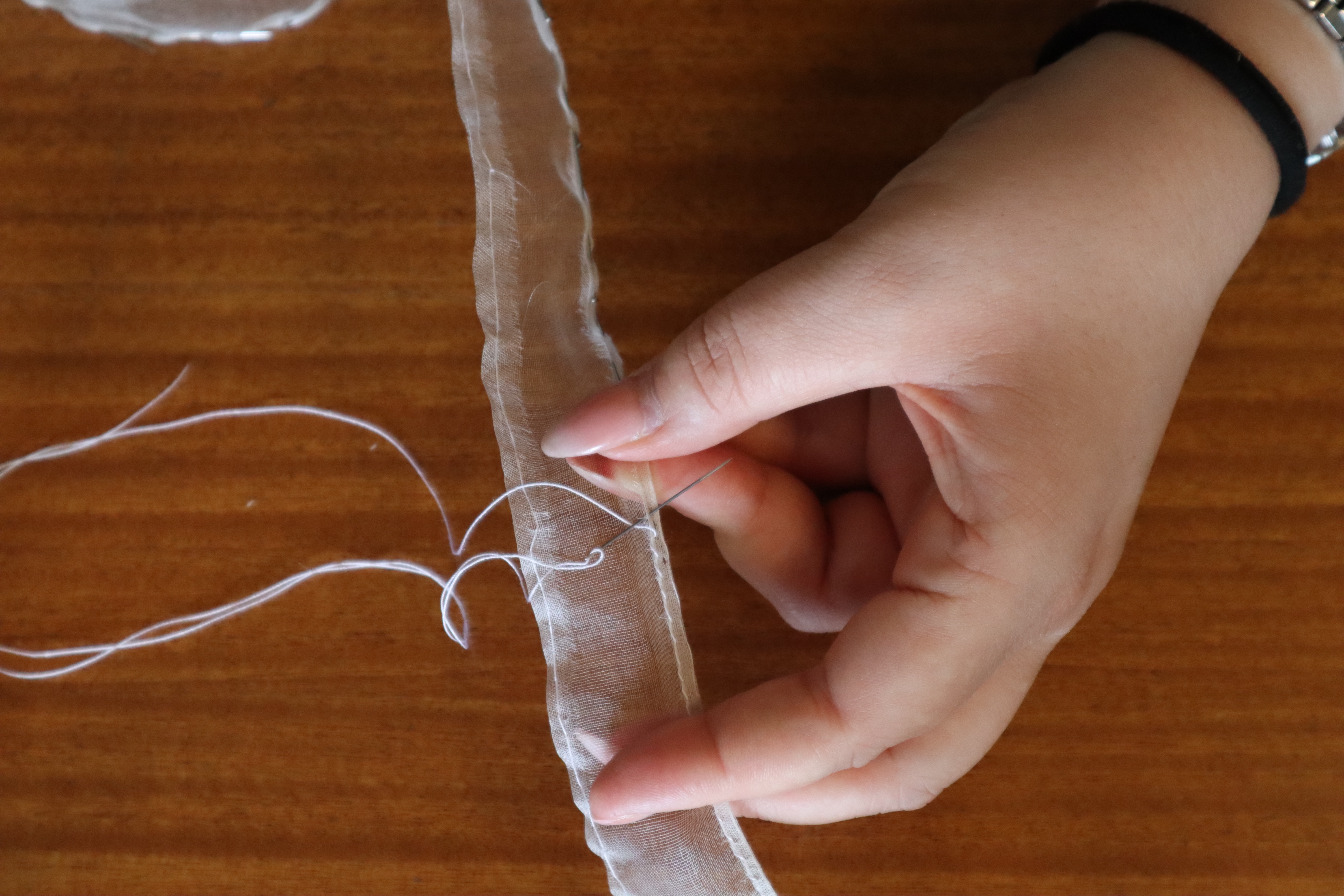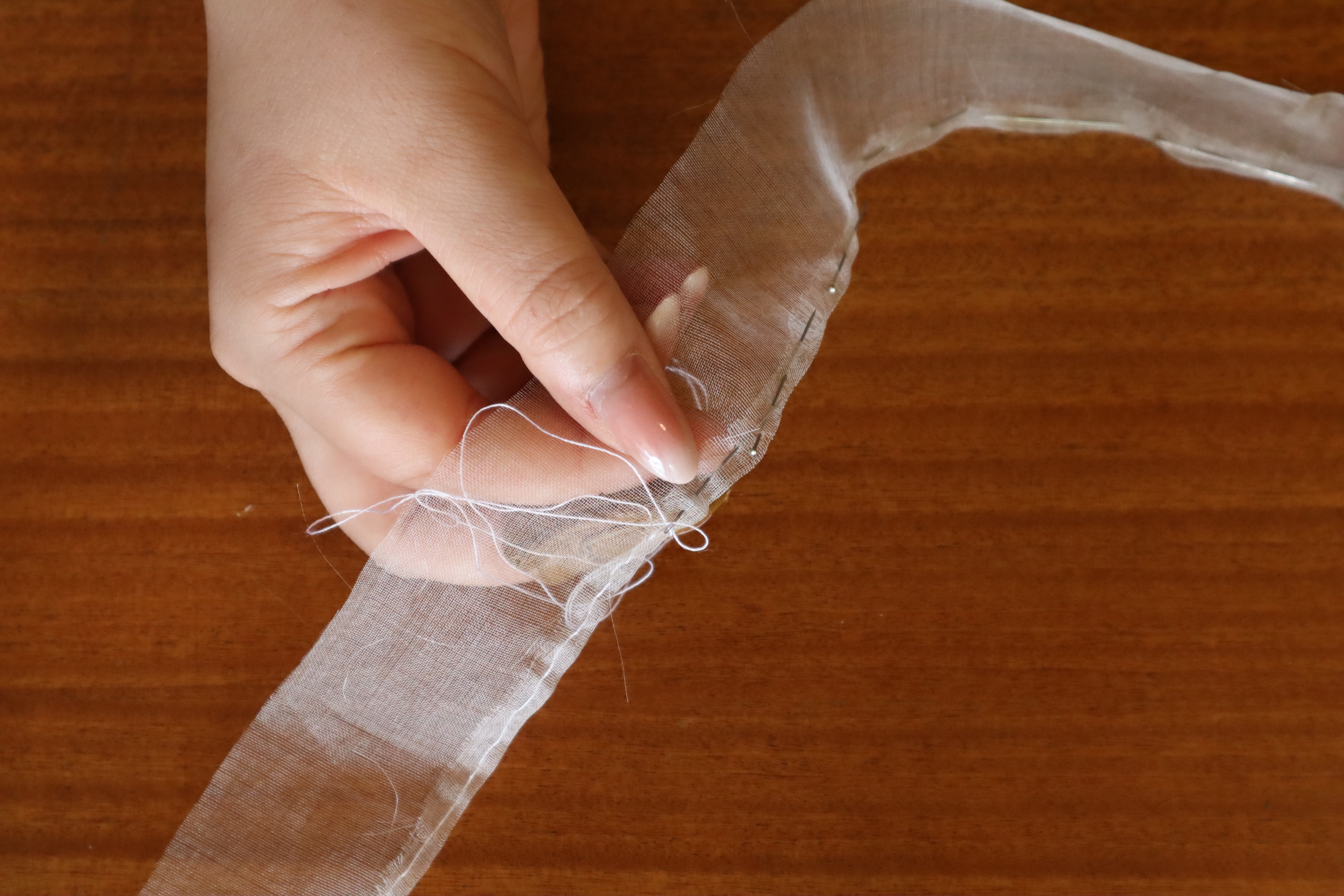 I pinned and stitched the organza to the base, along the two long edges. I also stitched the two organza strips together at the front, in a nice peak shape.