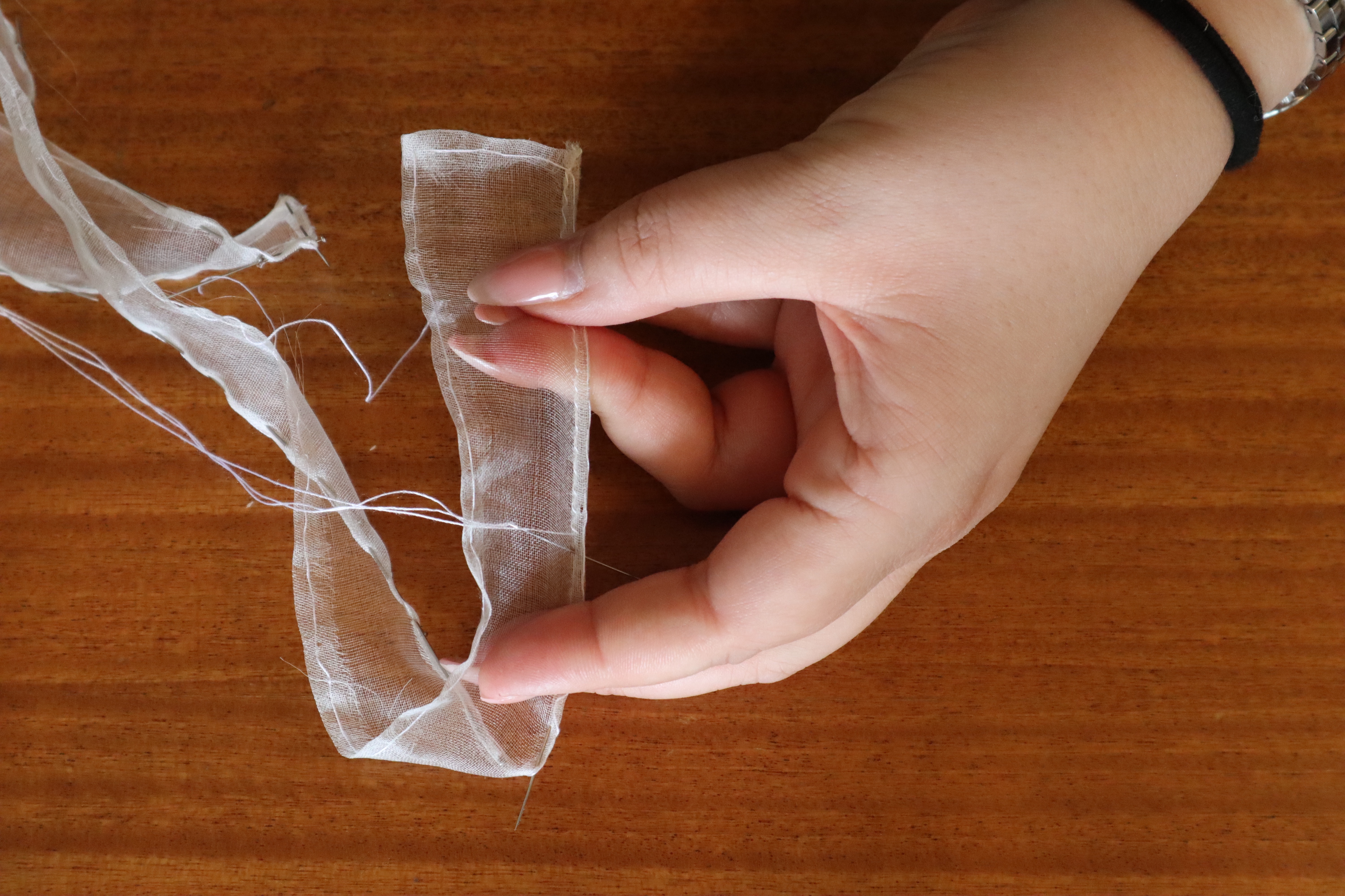 I then spent waaaay too much time basting and hemming the organza strips. Not because the result wasn’t good, but because I discovered (after having removed the basting stitches and made some gathering stitches at the center of each strip, of course) that the organza looked very funny gathered from the center. I could have saved myself a lot of time and thread by just using the basting stitches along one of the edges as my gathering thread. Oh well. This is a learning experience.