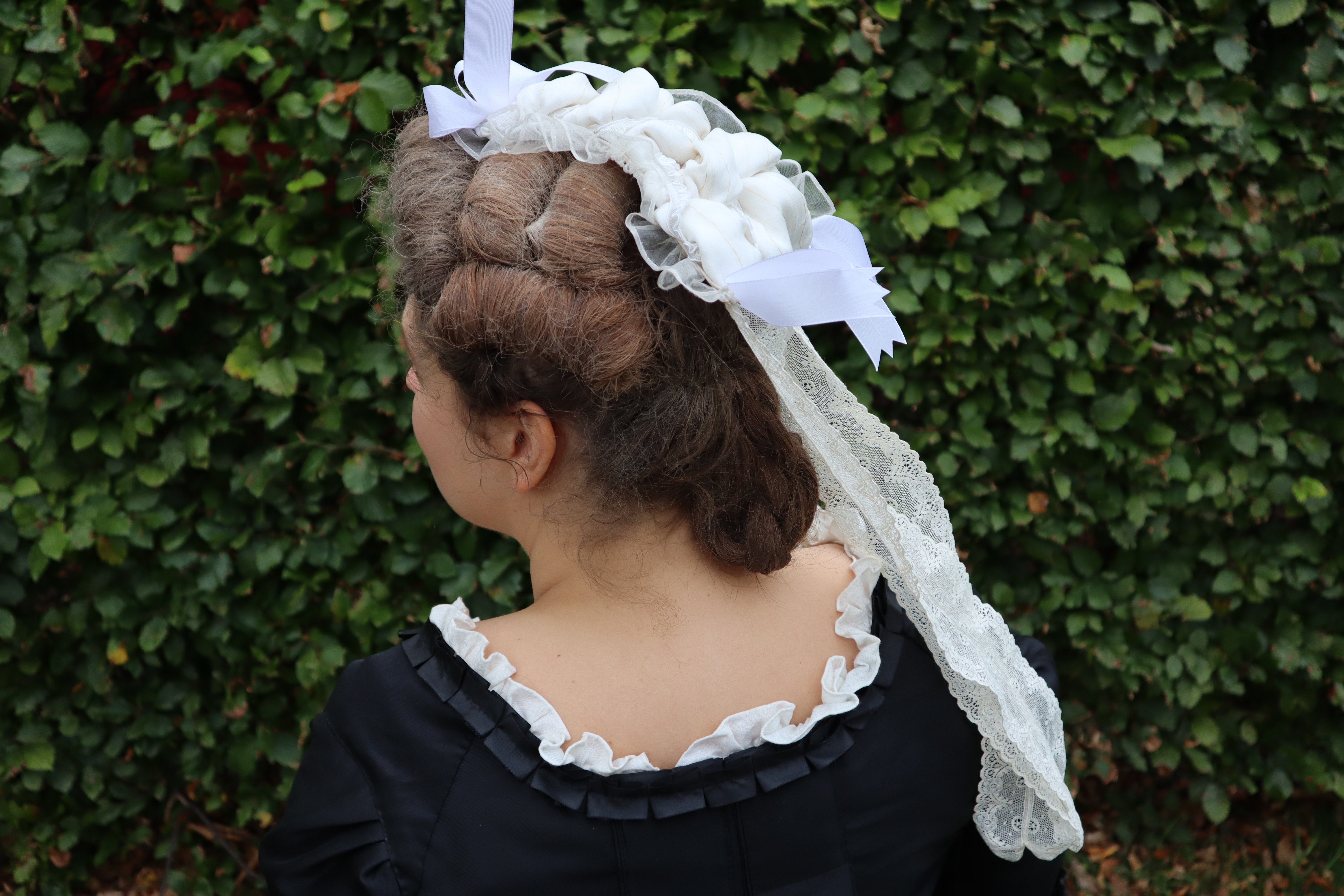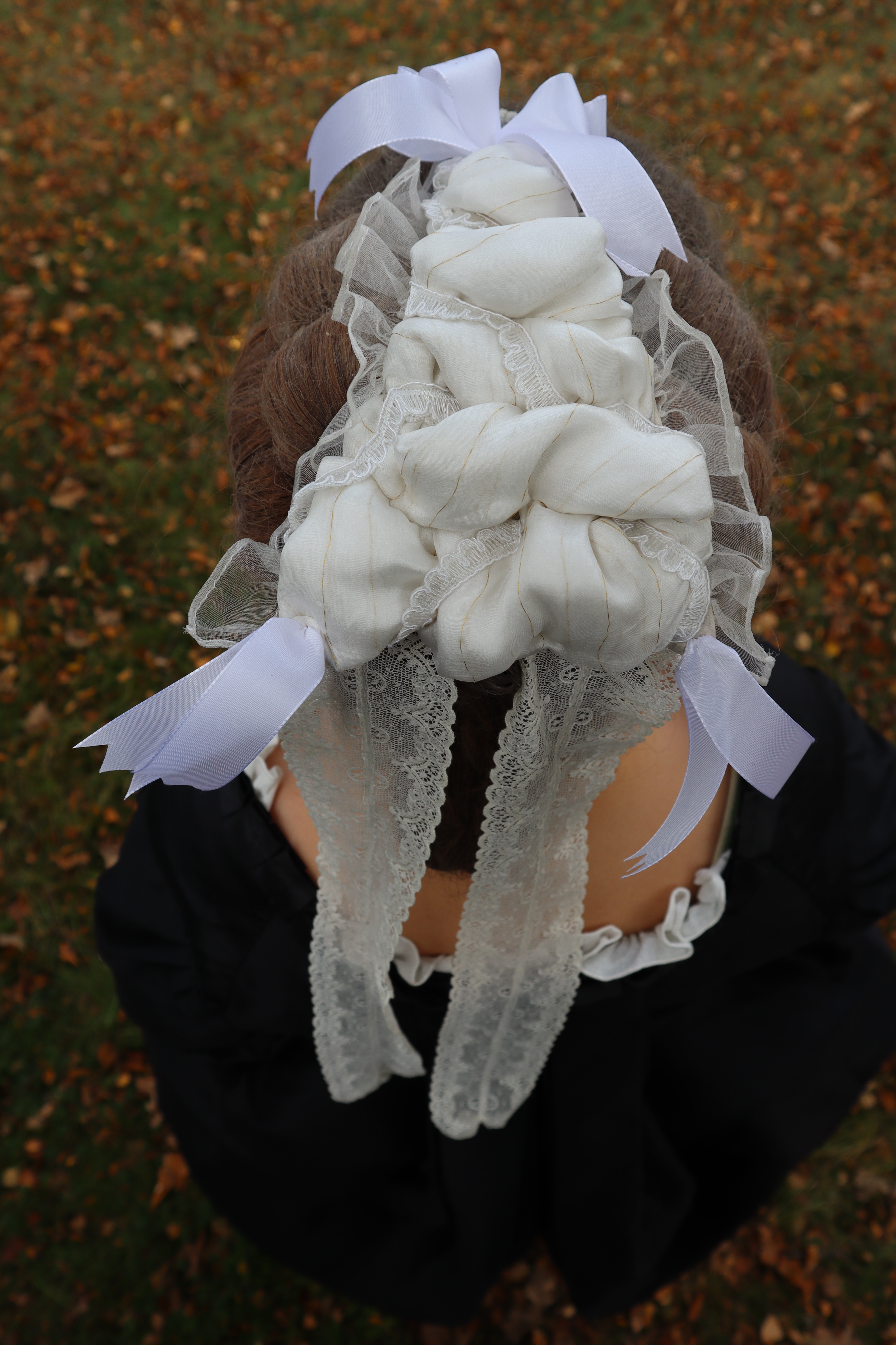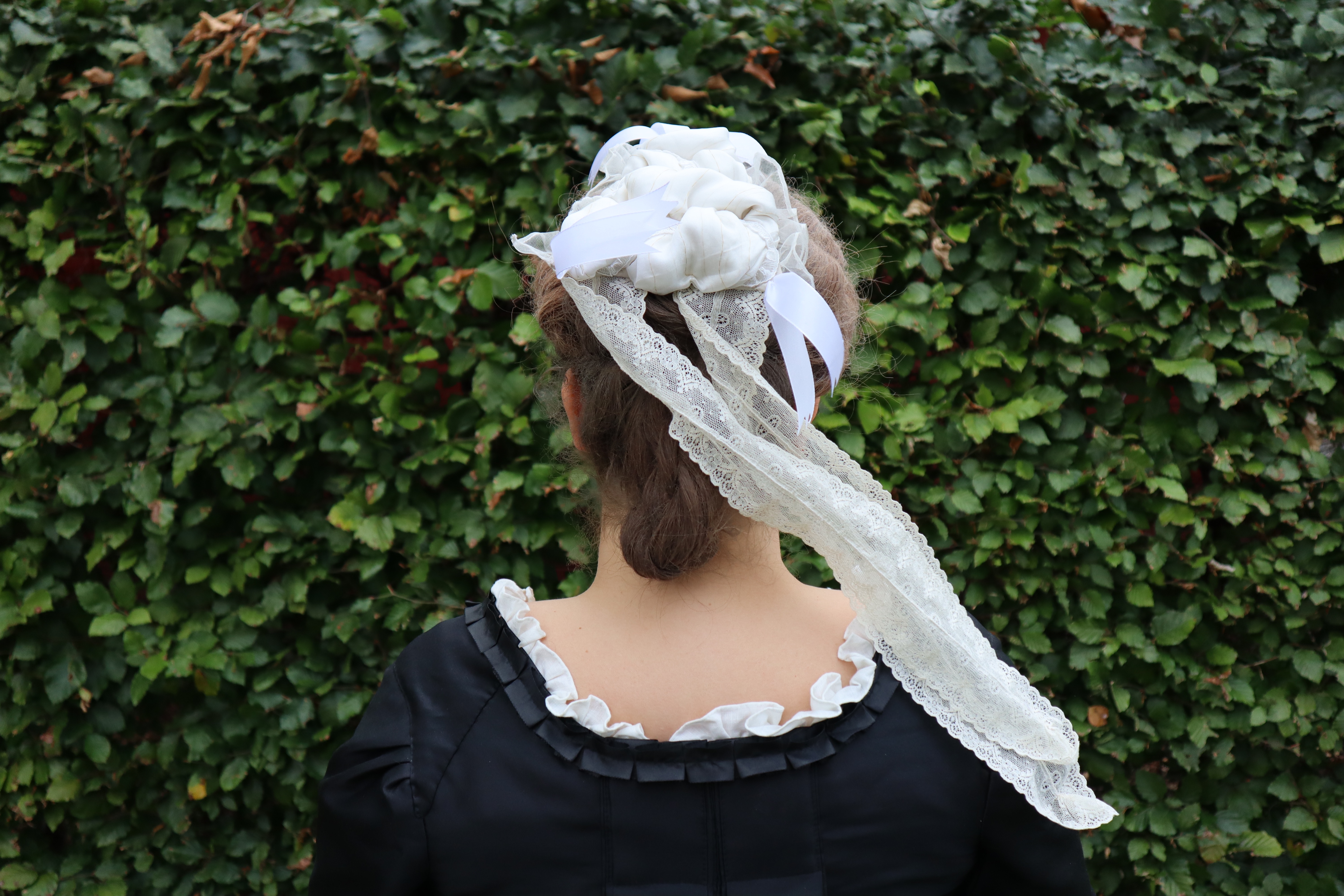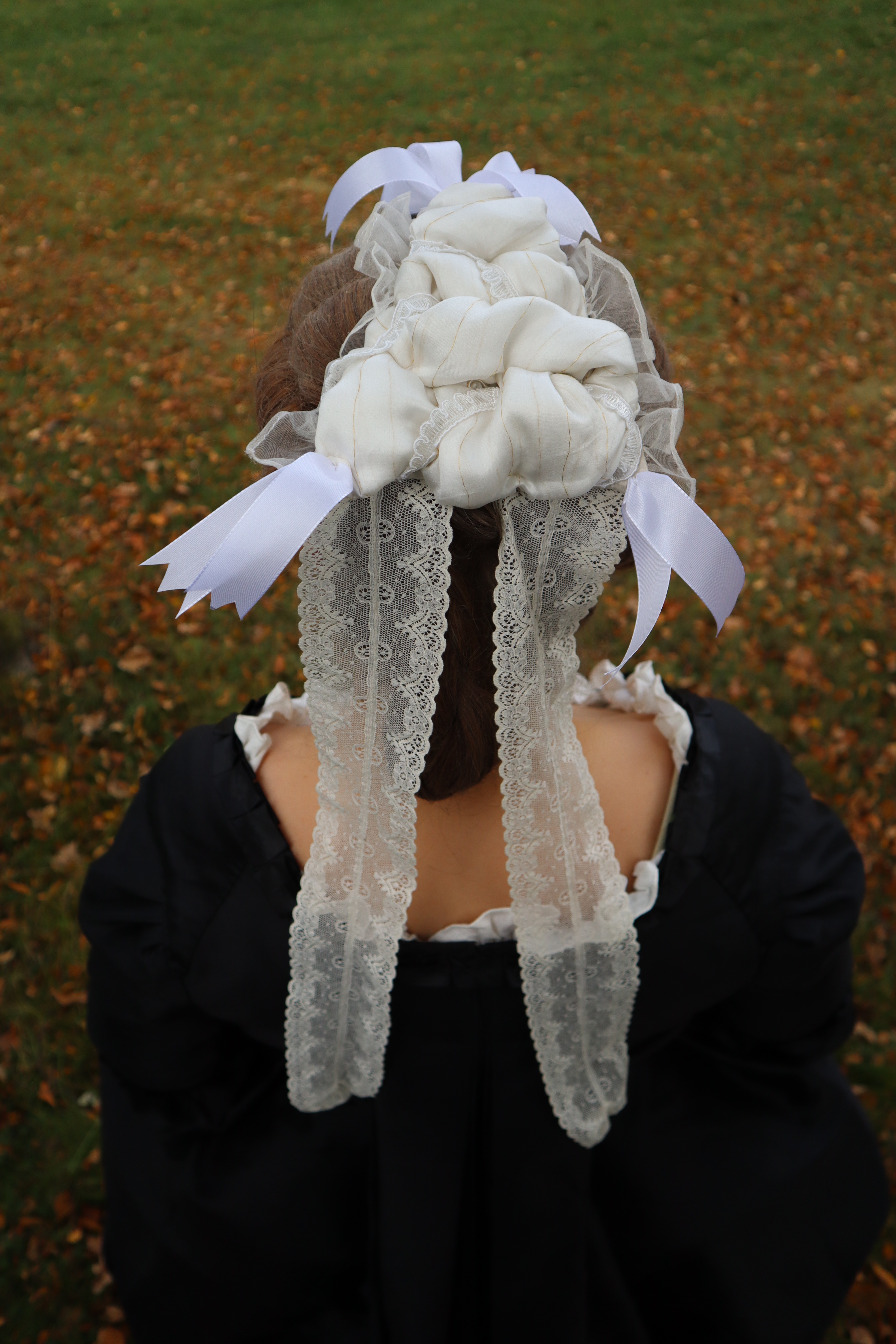 To really test if the lappets can be worn with more than one cap, I decided to make two very different kinds of caps; one fairly simple cap from ethereally translucent silk organza, and with a pleated lace frill, and one structural, triangular silk cap with lots and lots of trim on.