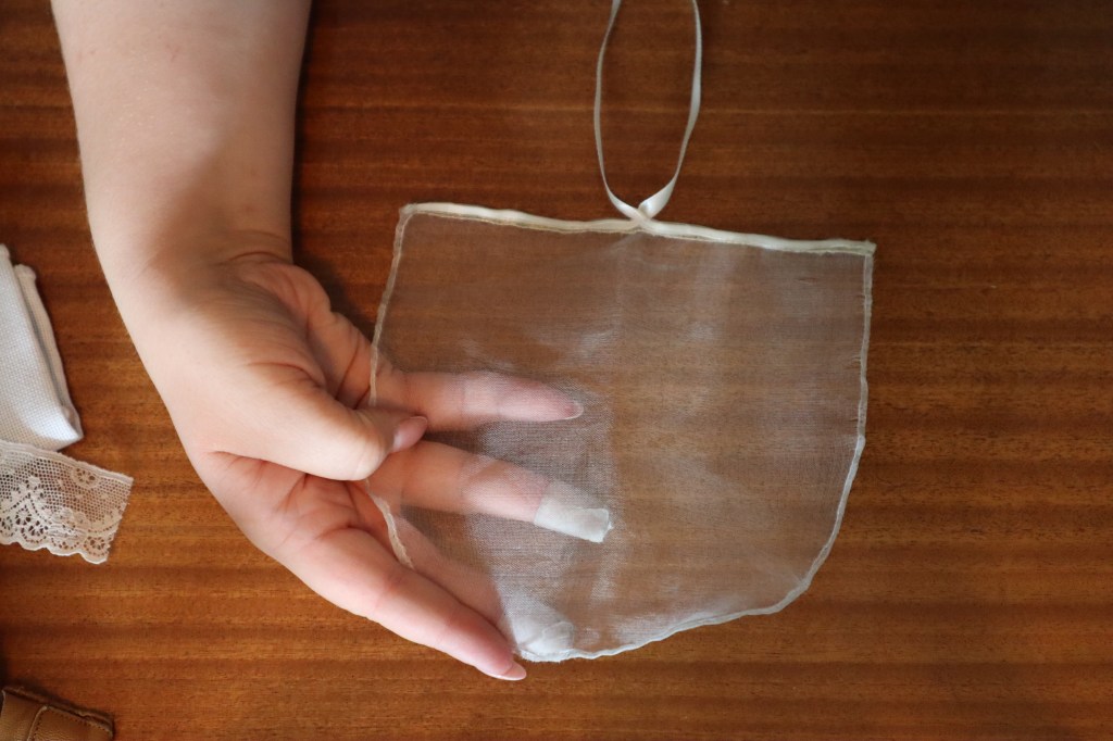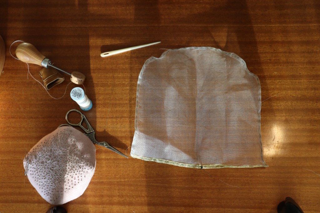 To shape it to my head, my cap needs a drawstring at the back, so I stitched a piece of narrow silk ribbon to each side of the straight back edge, and poked the ribbon loop through the eyelet hole.