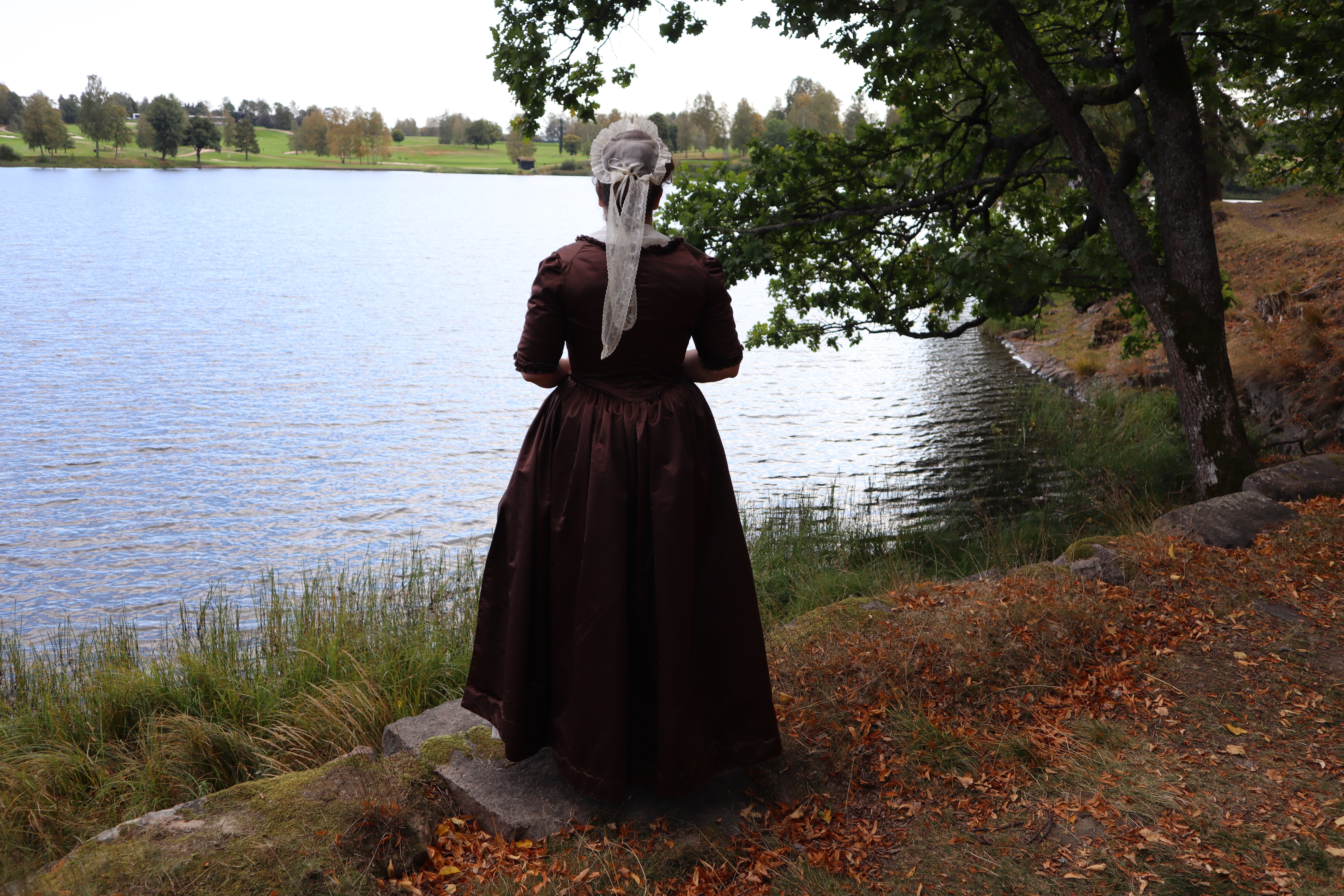 The cap in itself is done! But I wanted to have a pleated lace ruffle along the edge, so I used what I had left of the lace from the lappets, and pleated that to the cap, making a center front box pleat, and pinning the pleats as I went.